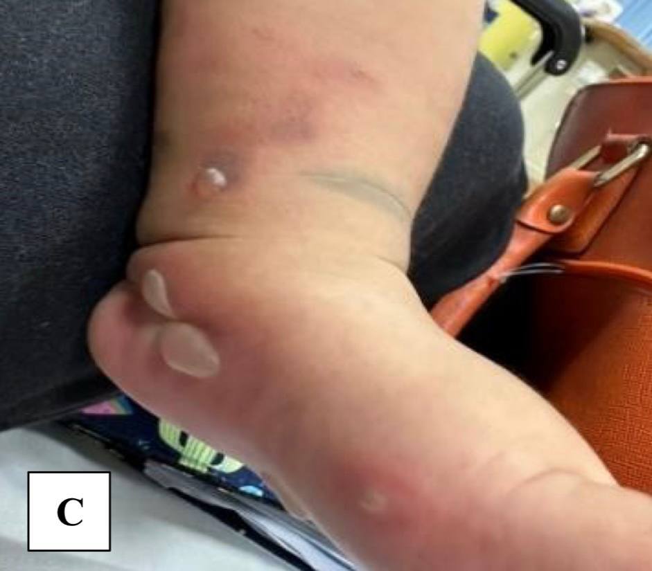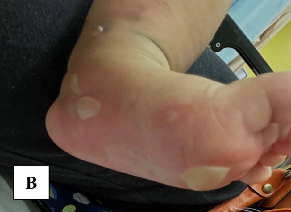 Когда мать обнаружила у мальчика эти изменения кожи, ребенок был немедленно доставлен в отделение неотложной помощи для дальнейшего лечения. При осмотре ребенка обе его ступни были эритематозными и теплыми, в дополнение к наличию множественных пузырей на обеих подошвах, причем самый большой пузырь размером 3×3 см. располагался на левой стопе (фото 1B и 1C) и 1×1 см на правой стопе (фото 1A).