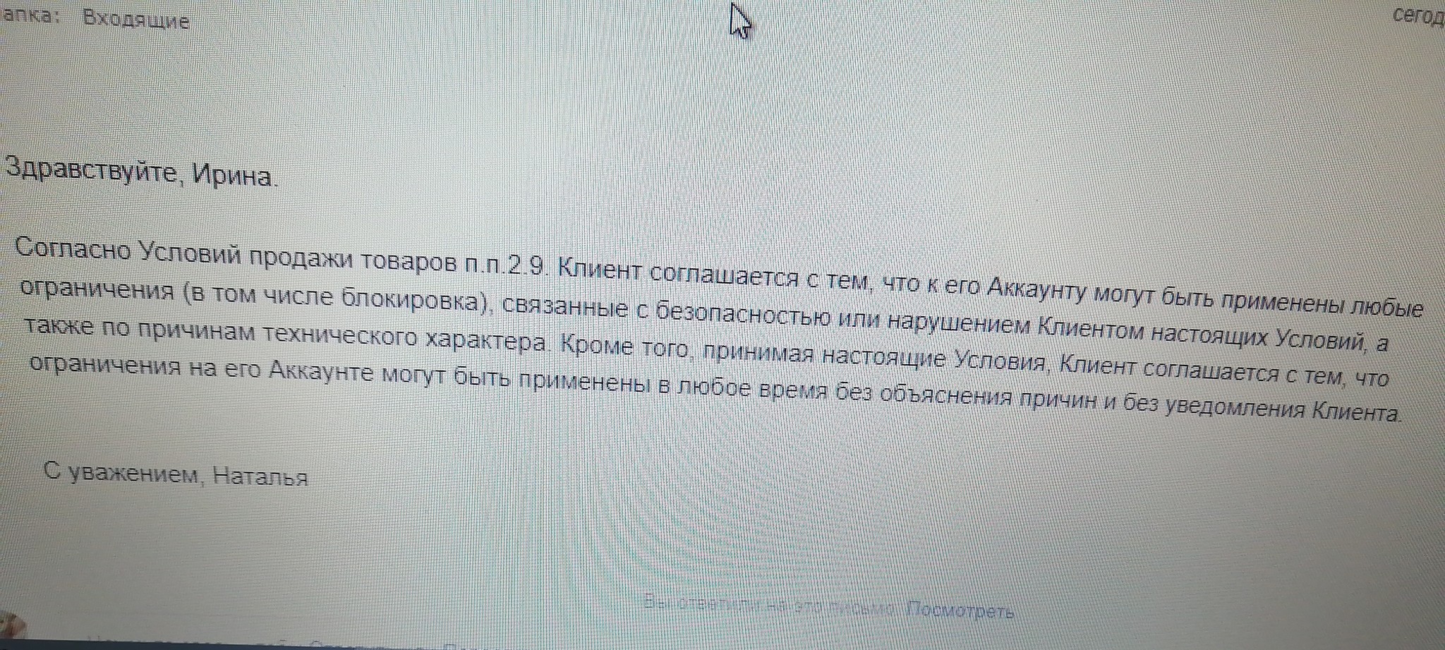 Четыре дня пыталась добиться объяснить, что собственно происходит. Ответ один : служба безопасности занимается этим вопросом, короче, отписка! Я уже подумала, что возможно ОЗОН обиделся на то, что прислал мне просроченные мюсли аж на 8 месяцев?! Даже не знаю... И сегодня в 10500 раз опять позвонила для уточнения вопроса, когда всё - таки будет восстановлен вход на страницу, оператор Вероника ответила, что НИКОГДА!!!! ПОСКОЛЬКУ, по моему номеру телефона обнаружили ещё одну неведомую мне страницу! Всё нормально?!