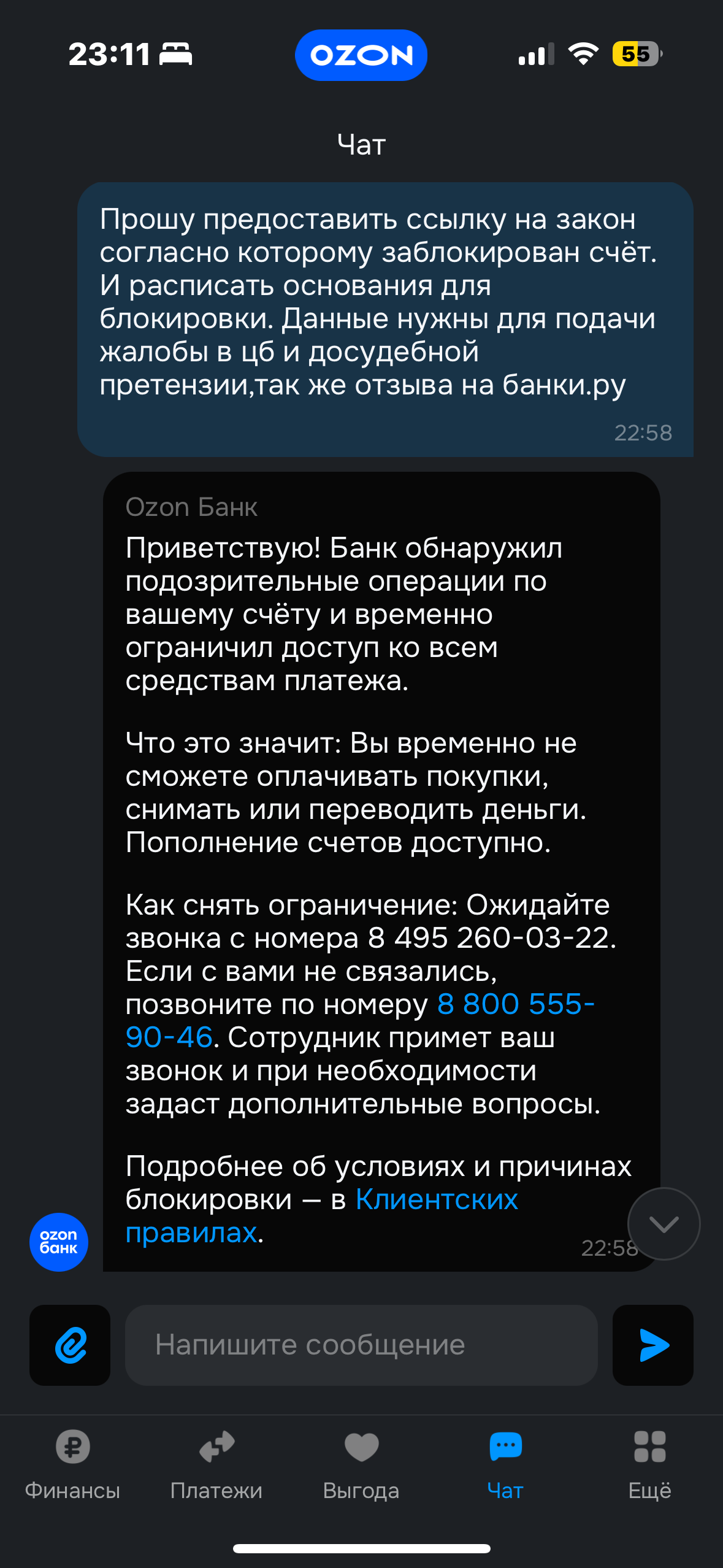 Озон банк удерживает средства и блокирует счет