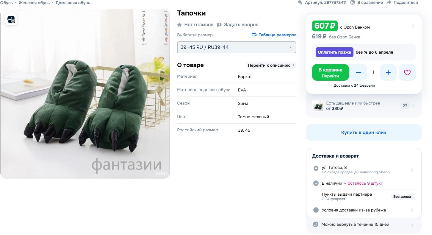 Сегодня решил сделать заказ тапочек в подарок. Нашел товар за 228 рублей, принял публичную оферту, деньги списались. Через некоторое время пришло сообщение об отмене доставки. Озон предлагает только повторить заказ или сделать заказ похожих товаров, но цена данного товара уже составляет 607 рублей. Товар есть в наличии, проблема не в этом, а в нежелании соблюдать условия оферты! До поддержки озона не достучаться - бот не пропускает. Как защитить свои права на данном этапе пока не понятно.