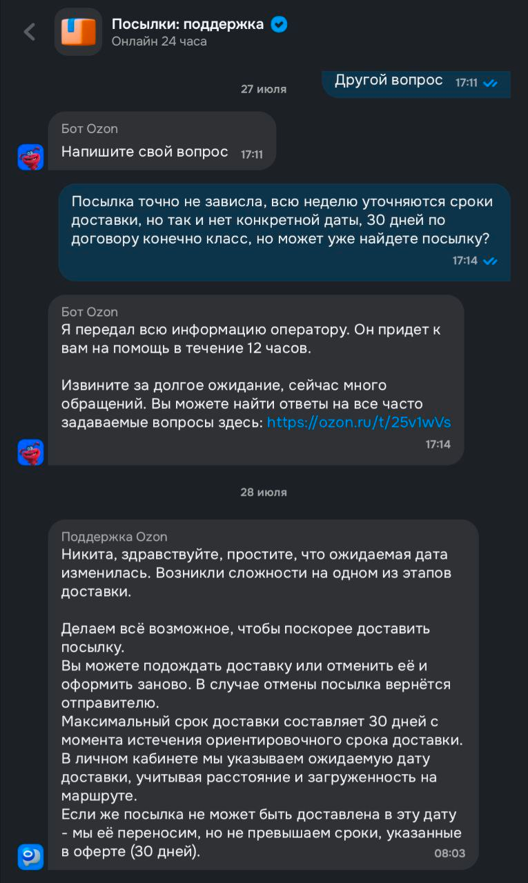 Не получив ничего внятного в очередной раз, я решил закрывать для себя вопрос, всё еще меня интересовало настоящее местоположение посылки, где именно её затеряли, или где она зависла. Реально рабочий способ был найден в комментариях к посту о запуске сервиса, советовали обратиться в ПВЗ, откуда уехала посылка и попросить их проследить путь, бываю там частенько при отгрузках и 1 августа уточнил у сотрудника, небольшой проблемой оказалось то, что я не фотографировал отправление(нужны были штрихкода озона для более быстрого поиска), но тем не менее сотрудник справился и нашел точно мое отправление, и однозначно сказал- скорее всего её уже не найдут, последний раз она была на сортировке в городе N еще 22 июля(не запомнил, выехала ли она, но уже не суть). Для меня все стало понятно, ибо тот самый город N- это город в 10 км от села назначения и посылка висит там уже больше недели. Для меня это отправление похоронено, данный сервис забыт как страшный сон....
