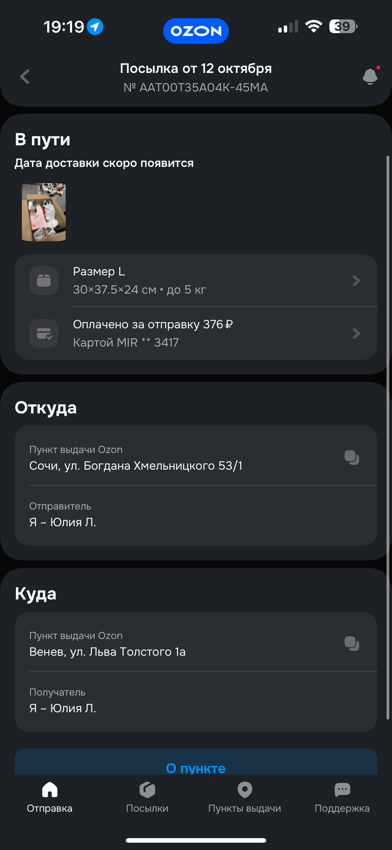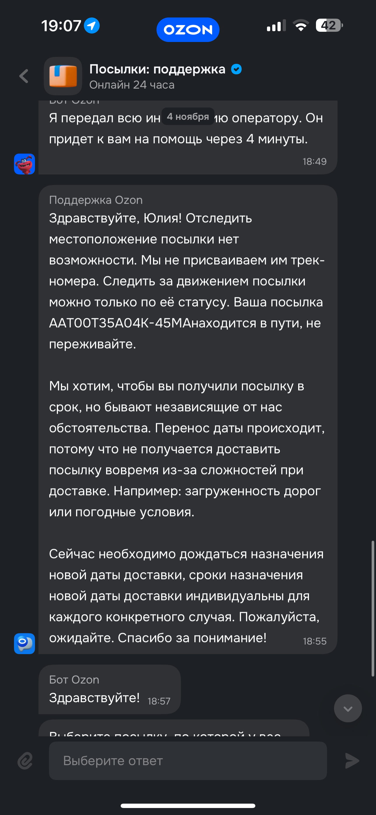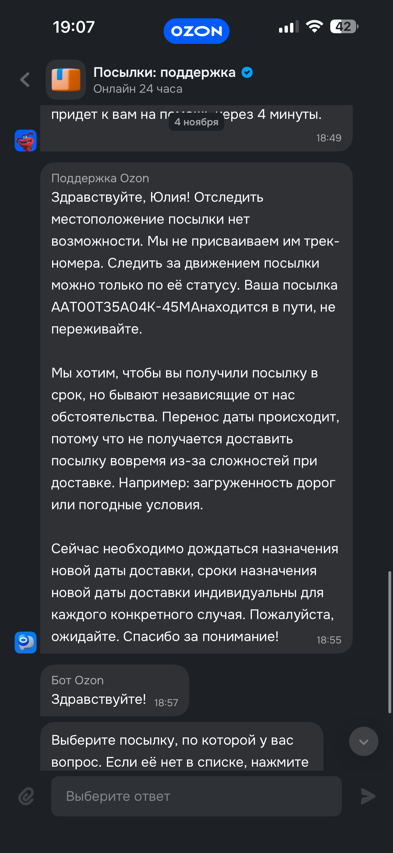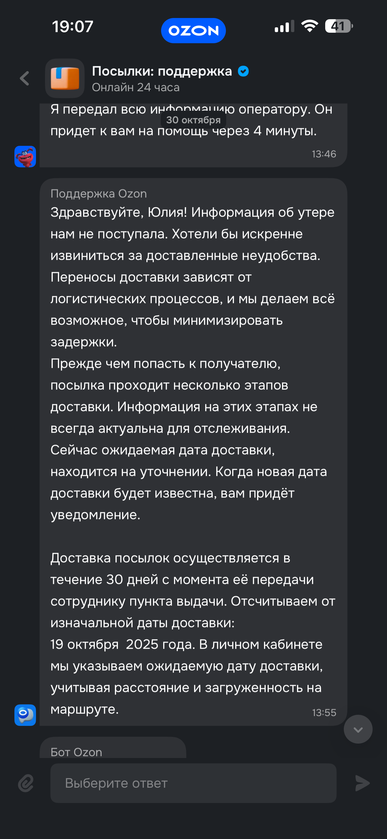 Здравствуйте дорогие читали. Тут уже был пост моей дочери о данной посылке, но пока безрезультатно, к сожалению. Речь про посылку AAT00T35A04K-45MA. 12 дней назад был написан пост здесь, что срок доставки постоянно переносился, потом вовсе пропал. Озон ответил, что разберется, что посылку ищут коллеги (8 дней назад был этот ответ) По сей день так ничего и не изменилось. Но самое интересное в этой ситуации, что поддержка ни сном, ни духом, что с посылкой что-то не так. Они уверяют, что она в пути, что прибудет в ближайшие дни. Что все идет как надо, не надо волноваться и переживать. То есть поддержка либо вообще не знает ничего, либо хорошо вешают лапшу на уши, как и всем людям здесь, чьи посылки так же потерялись, а им говорили, что все хорошо и все придет. Прошлый пост с этой посылкой был написано как только срок доставки пропал, а с момента отправки прошло всего 10 дней, шанс найти посылку был велик, так как прошло мало времени, но даже это не спасло ситуацию видимо. Еще есть 2 недели до конца срока, но так понимаю они ничего не решат. Вещи наши действительно жаль, купить их и испытать положительные эмоции на отдыхе прекрасно, а теперь только горечь от всей этой ситуации.