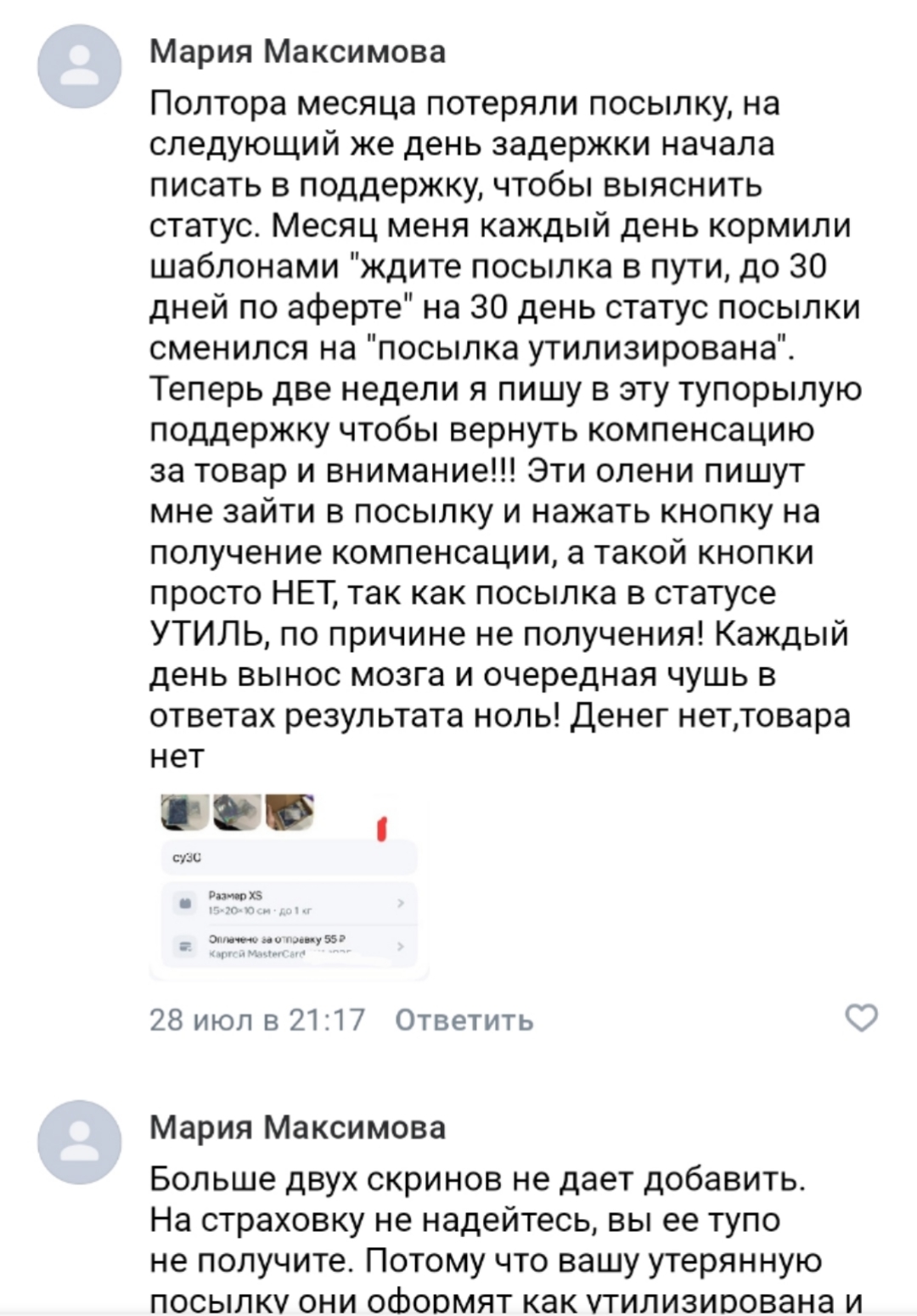 На днях была отправлена посылка озон доставкой.Многооооо ручной работы(кукольная обувь), знаете что получил человек в пвз? Кусок наждачки!!! сотрудники озона тщательно фотографируют содержимое перед отправкой(теперь я крепко задумалась,а для чего? ....) и бац...посылка пропадает! И мой случай не единичный,прикреплю скрины из ВК обсуждения....Кнопки компенсации нет.То есть да ,вы застрахуете посылку,отдадите не мало денег,но кнопки компенсации просто нет) Вообще! Очень удобно.Я надеюсь,что моя посылка найдется. И вернётся.Просто так не слезу с сотрудников озон.Повоюем...Кстати! Сегодня узнала,что сами сотрудники тоже могут только писать в чат тех поддержки,нет у никаких телефонов ..Вообще удобно,правда? То есть крайних нет! Вообще!!!