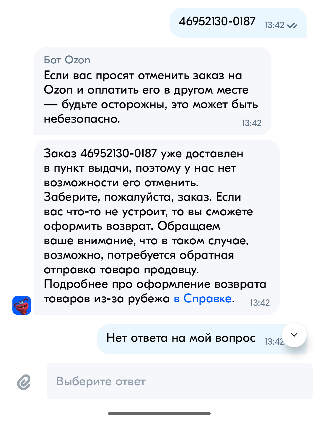 На китайских площадках на момент заказа не было того, чего мне хотелось, зато на озоне обнаружился приемлемый вариант. Продавец надёжный, представлен в том числе на Али, но доставка оттуда очень дорогая. Отзывы тоже хорошие. Решил взять. Да, был наслышан про то, как косячит Озон с продавцами - мошенниками из за рубежа. Но тут проблем не предвиделось. Собственно купил и начал ждать. Первый звонок появился, когда посылка застряла на 20 дней на таможне. Я начал выяснять в чем причина через поддержку -чат Озон. Честно - тысячу хуев тому идиоту во все отверстия, который придумал озоновского чатбота. Такое ощущение, что их целью было максимально отстраниться от поддержки клиентов живым оператором. Там меня уверили, что все в порядке и такое бывает. Я же сам чуть позже увидел, что в моей фамилии (получателя) допущена ошибка. Оператор озона заверил меня, что ничего страшного этом нет. Продавец - китаец мне сообщил, что поменять ФИО получателя он не может и делать надо это через Озон. Ну ладно. Посылка к этому времени пришла в отделение Почты России. Там выяснилось, что они мне не мог выдать ни посылку, ни таможенное уведомление для оплаты пошлины на таможне, даже не смотря на то, что совпадали все данные, кроме одной буквы в фамилии. Сказали, пишите в озон. После этого я потратил 4 долбанных дня на то, чтобы объяснить оператору озон причину, попутно получая тонну отписок. Заявку оператор все же отправил на смену ФИО получателя, но она была отклонена СЛУЖБОЙ ДОСТАВКИ ОЗОН. Причем заявка была послана дважды и с нулевым результатом. В итоге имеем странную ситуацию. Посылка тут. Деньги заплачены, я получить ее не могу, но Озон упорно делает вид, что все нормально, не пытаясь разобраться в проблеме. Отменить заказ они также якобы не могут.