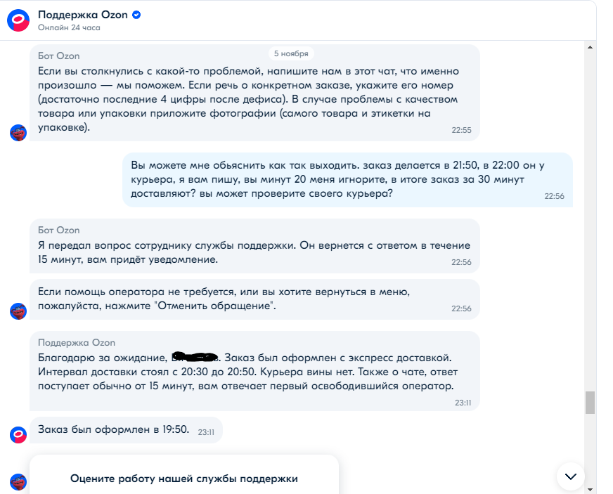 Время 22:20, заказ еще у курьера, поддержка пишет что оператор ответит через 20 минут. Я весь на панике.
