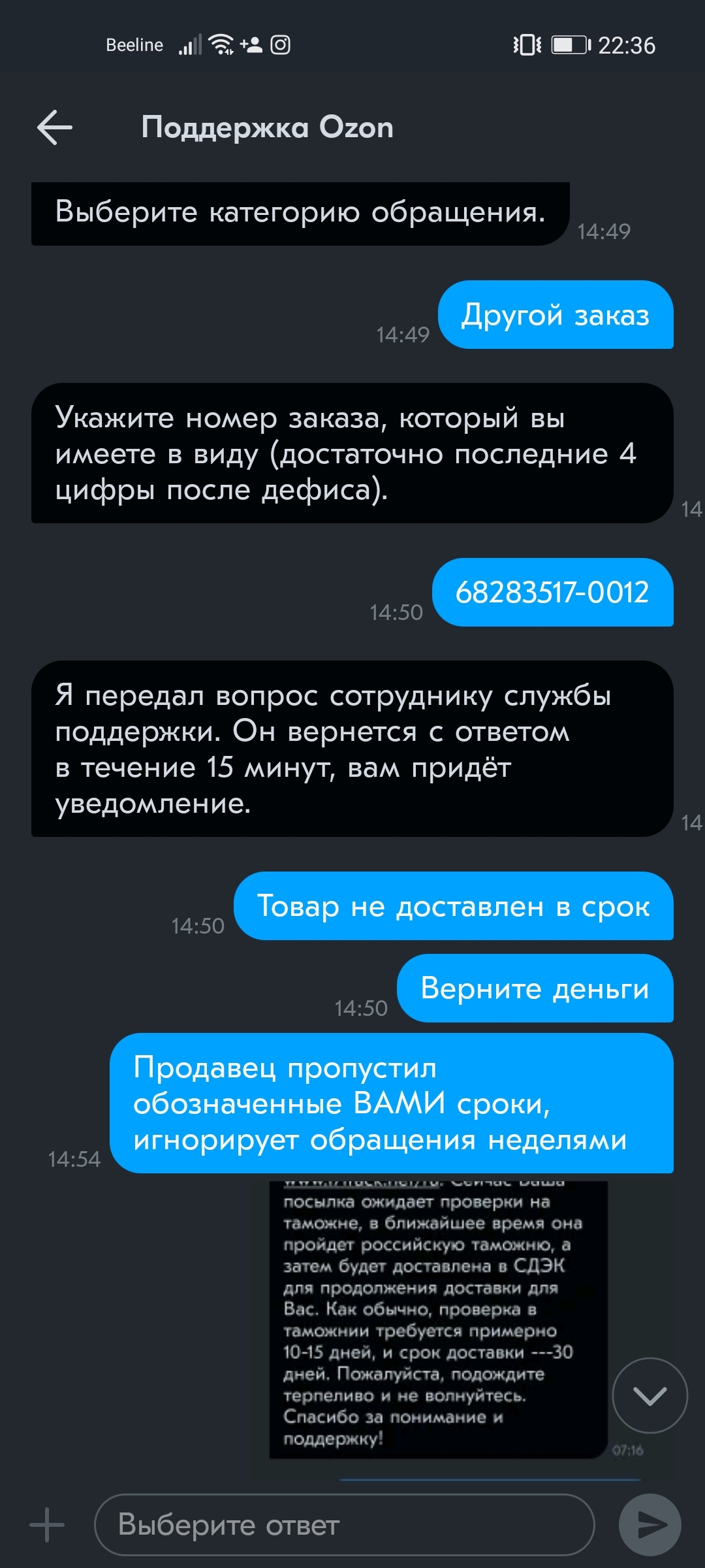 Интересно, а если продавец отправил камень и он придёт через полгода, мне тоже ему писать? Видимо озон считает что да.