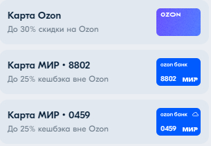 Например, возможность получить сразу 3 карты Озон банка – внутреннюю скидочную, виртуальную для внешних платежей и полноценную пластиковую. Все три с бесплатным обслуживанием.