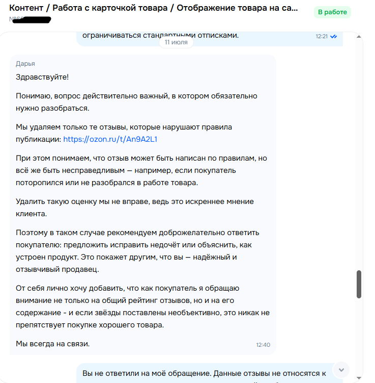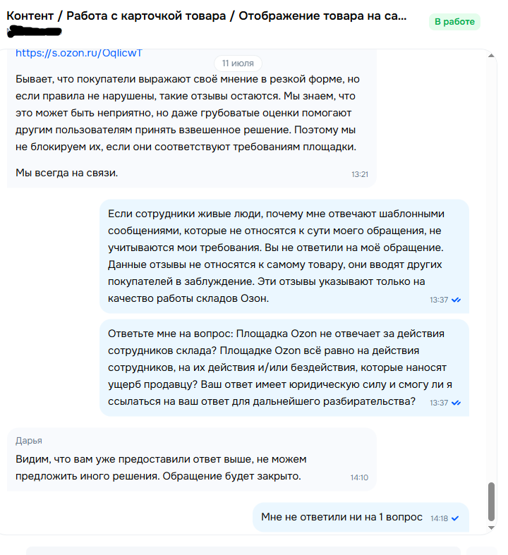 Шаблонные ответы и ничего более. Вот такое отношение площадки к продавцам. По сути мы имеем: сами Озон накосячили, ничего делать не хотят, исправлять тоже.
