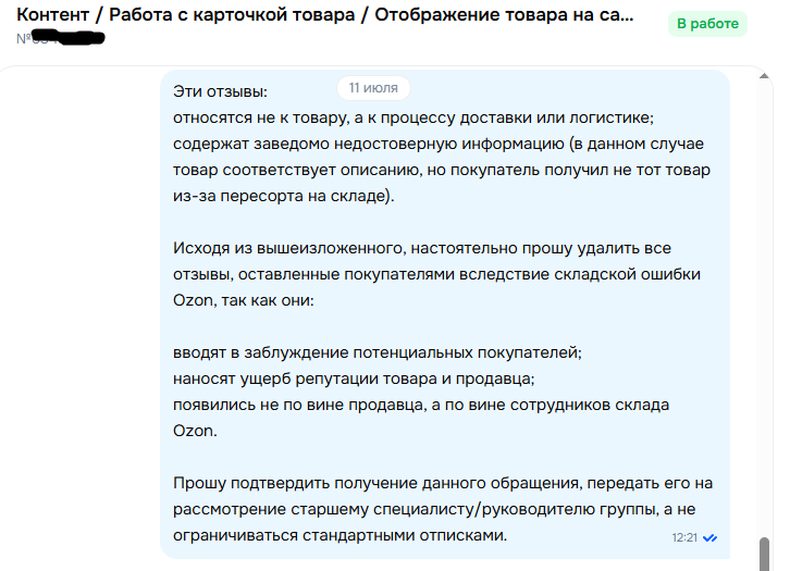 Эти негативные отзывы не связаны с качеством или характеристиками товара, они напрямую связаны с внутренней ошибкой обработки склада Ozon. В соответствии с принципами добросовестного делового оборота, продавец не может нести ответственность за ошибки, допущенные логистическим партнёром.