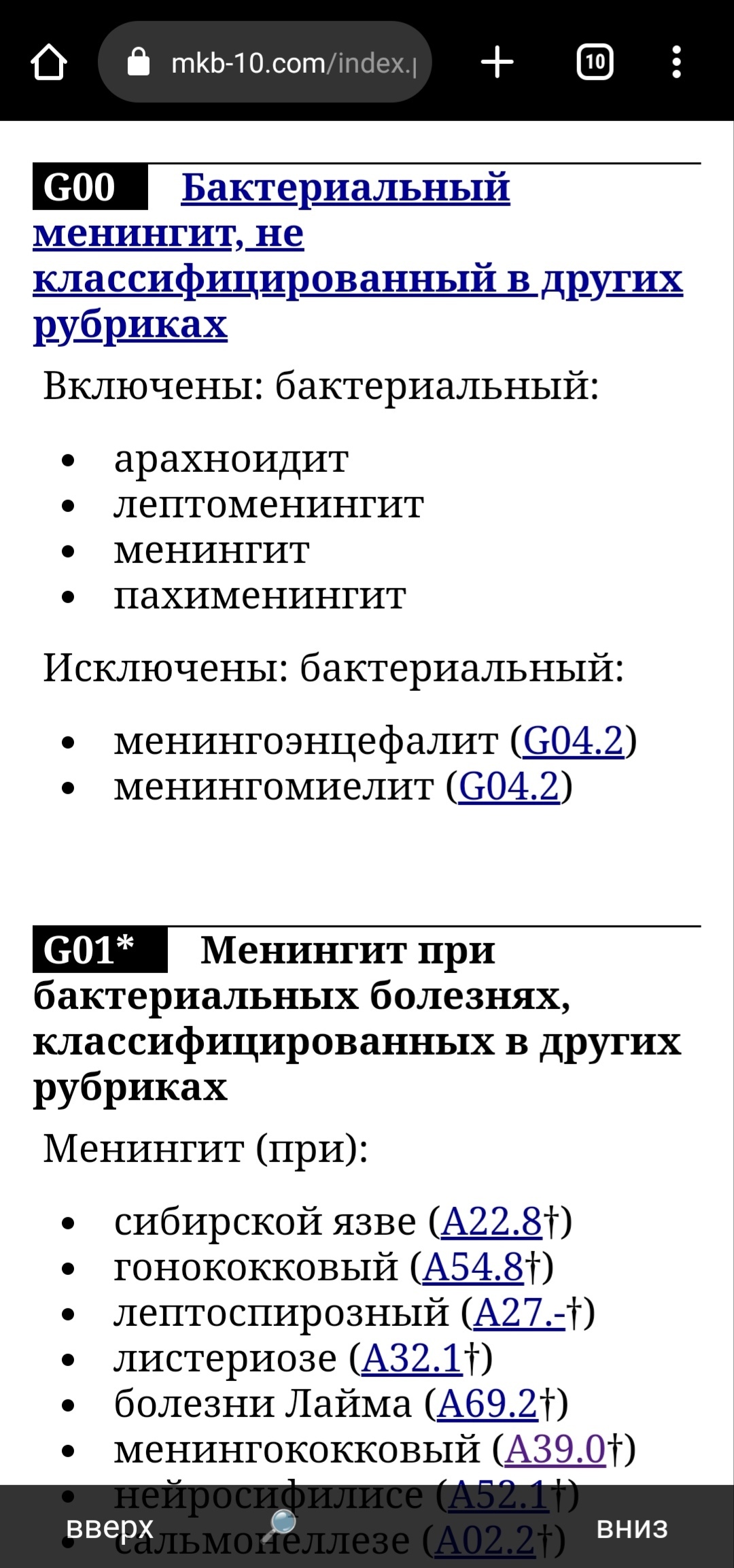 3. Мкб менингита G0*.* А тут D32.0 Доброкачественное новообразование мозговых Оболочек головного мозга