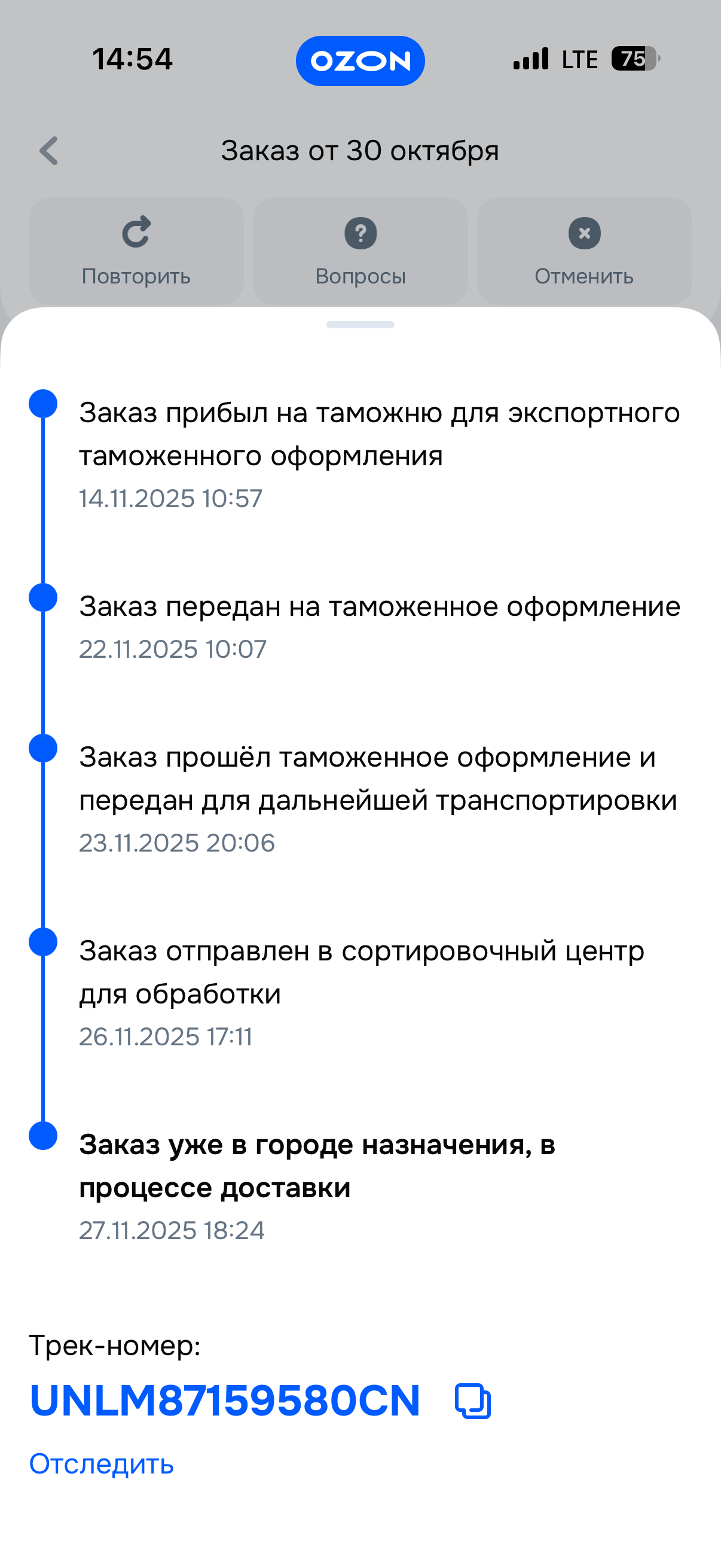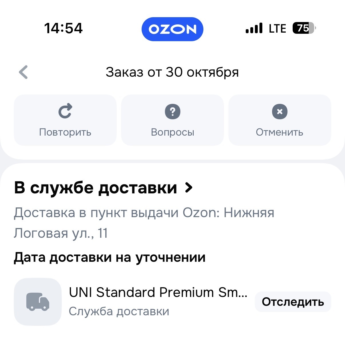 31864947-0056 заказ. Сроки доставки постоянно изменяются. По данным трек-отслеживания заказ уже в городе доставки, но с 28.11.2025 заказ в пункт выдачи не доставляется, информации по конечной дате доставке нет. Сейчас статус на протяжении 2х дней: «дата доставки на уточнении». Озон никакую четкую информацию по дате доставки заказа в пункт выдачи не дает. Теперь думайте, брать в следующий раз там заказ или нет
