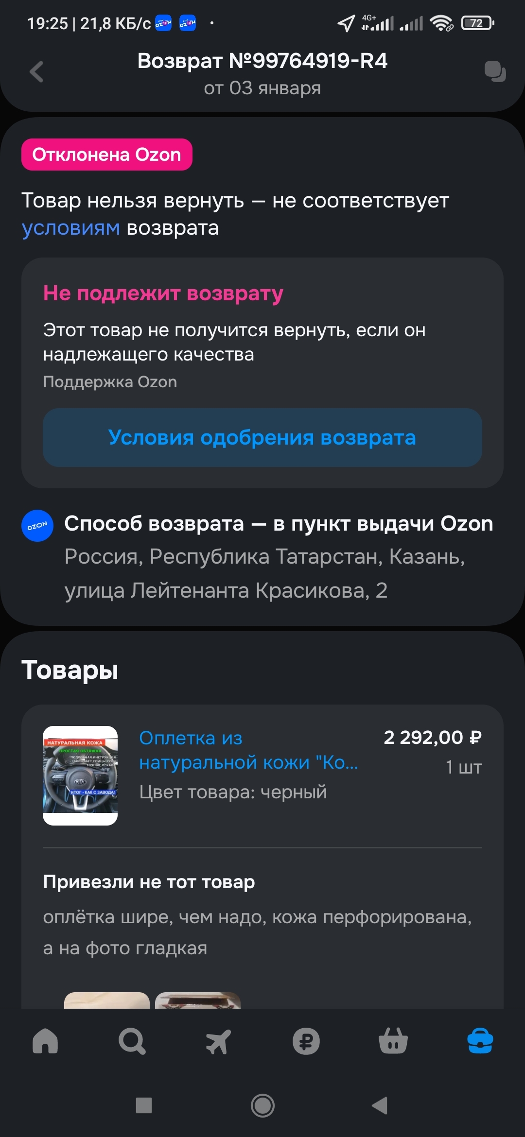 Заказал на красно-синем маркетплейсе кожаную оплетку на руль, так как родная уже поистерлась, надо бы заменить. Товар пришёл, всё хорошо упаковано, но сама оплётка лежала другая. Такое иногда бывает, когда под одним штрих-кодом лежит другой товар, называется пересорт. Но слишком умный бот не утвердил заявку на возврат, по причине того, что товар надлежащего качества. На всё мои попытки объяснить ситуацию в чате получал стандартные отписки. @Ozon, что происходит? Почему я должен платить за товар, который мне не подошëл?