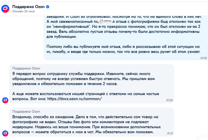 Отказ Ozon'а публиковать довольно длинный отзыв из-за того, что он "неинформативный" не выдерживает никакой критики. Ведь на странице товара девять (!) пустых отзывов с пятью звездами.Делаю вывод, что причина отказа в публикации это две звезды. Немного погуглил и нашел довольно большое количество таких ситуаций, когда по надуманным причинам отзывы не публикуются. Что ж, спросим у поддержки.