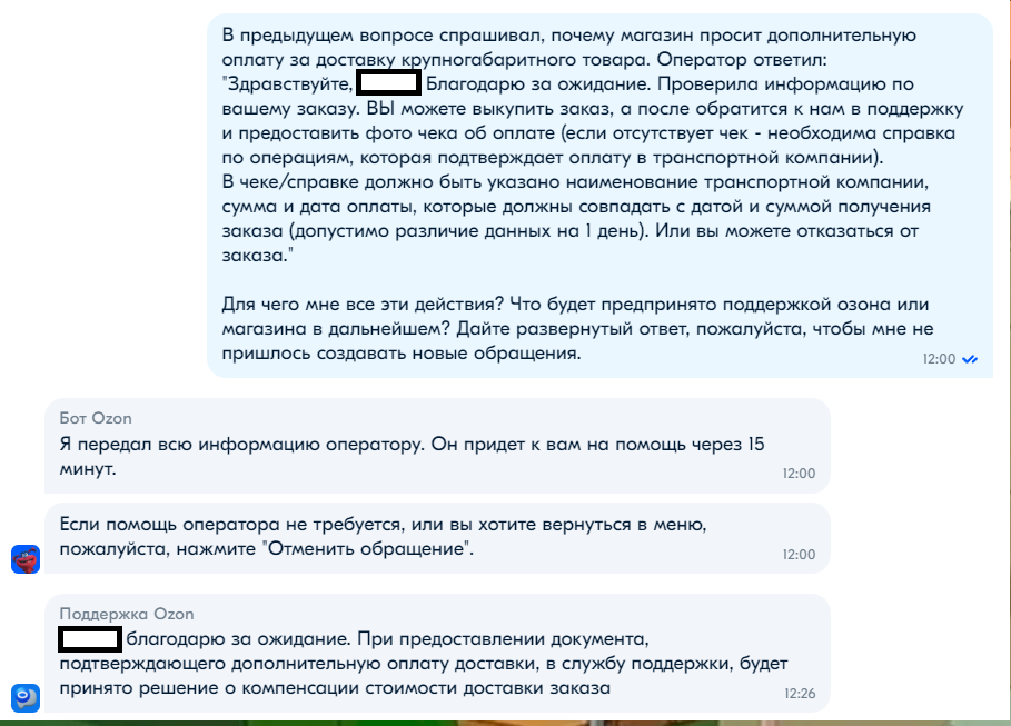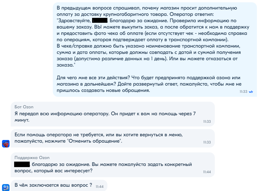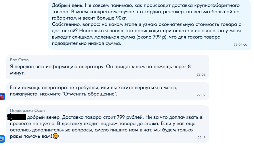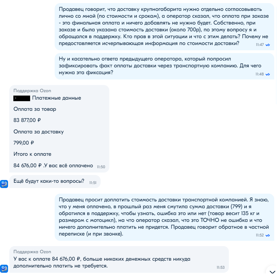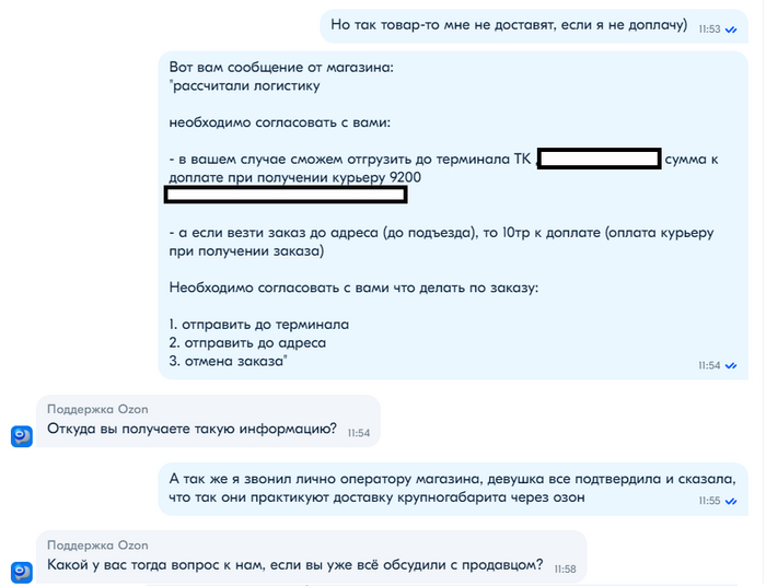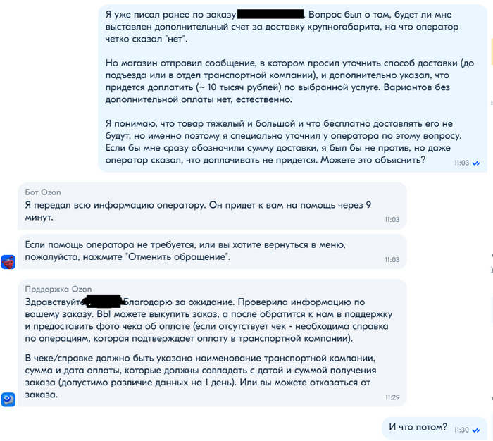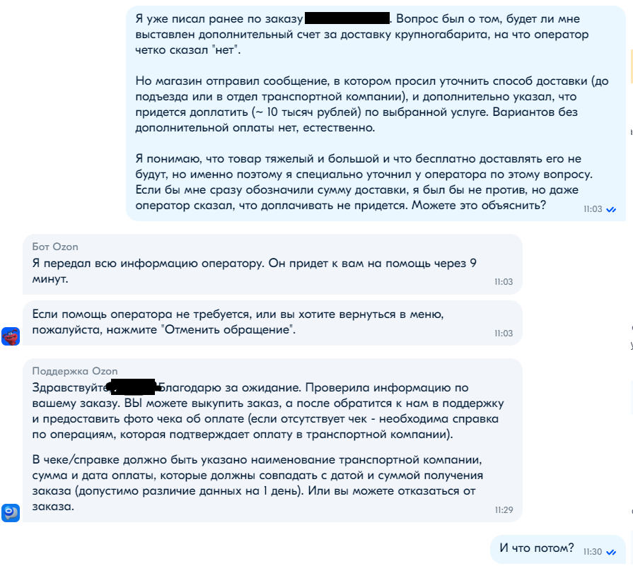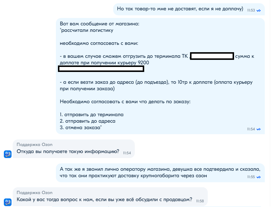 Поддержка магазина оказалась на удивление корректной и участливой, девушка рассказала все от и до и обрисовала каждый вариант по отдельности (за что ей отдельное спасибо), и я почти было сказал "ок", но решил все таки пробить поддержку озона, чтобы получить ответ на свои вопросы. (напомню, необходимость доплатить не была для меня неожиданностью, но это все таки неприятно).