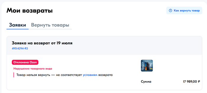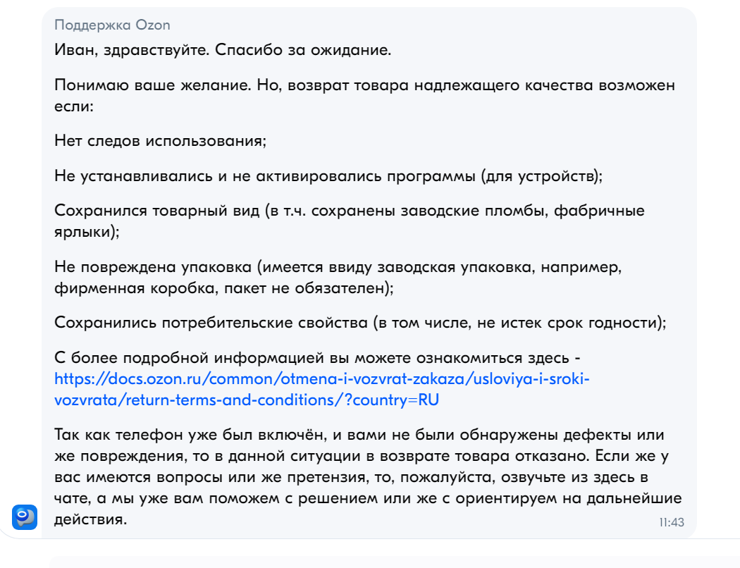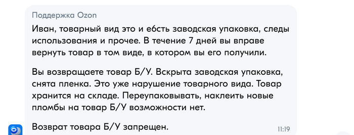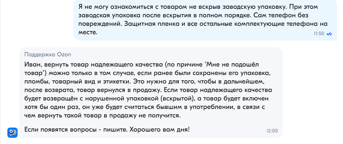 При этом на Озоне продается буквально тысячи "уцененных смартфонов" которые также просто вернули по причине "Не подошел". Т.е. товар надлежащего качества, просто со вскрытой упаковкой как у меня. Но вынести мозг решили именно мне. Повезло.