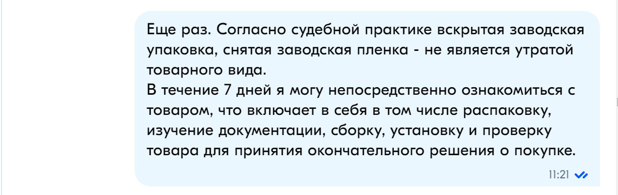 Если продавец считает, что был утрачен товарный вид или потребительские свойства товара, то продавец должен это ДОКАЗАТЬ. То есть доказать тот факт, что состояние возвращенного товара ОБЪЕКТИВНО мешает его дальнейшей реализации в связи с утерей товарного вида или потребительских свойства. Ссылки на факт установки, использования и нарушение заводской упаковки товара сами по себе не являются законным основанием для отказа в возврате. Смотрим пример из судебной практики, где продавец отказал потребителю в возврате товара надлежащего качества со вскрытой блистерной упаковкой: Предусмотренное в ст. 26.1 Закона РФ «О защите прав потребителей» право потребителя на возврат товара надлежащего качества в 7 - дневный срок с момента его передачи, служит для защиты интересов потребителя, который при продаже товаров дистанционным способом лишен возможности непосредственного ознакомления с товаром, не имеет возможности проверить товар до его покупки.11:11