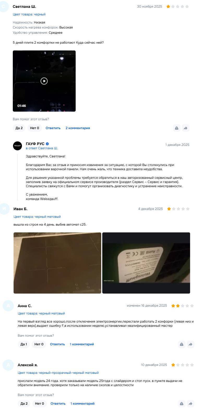 Я купил индукционную варочную панель Weissgauff. Она сломалась в первый же день, и Озон отказывается её принять. Плиту я купил на замену своей другой плите: Maunfeld - которая сломалась ровно через 2 года, когда кончилась гарантия, замена блока мне насчитали на 15тыс, тогда как она стоила 25тыс, а сейчас 39тыс.