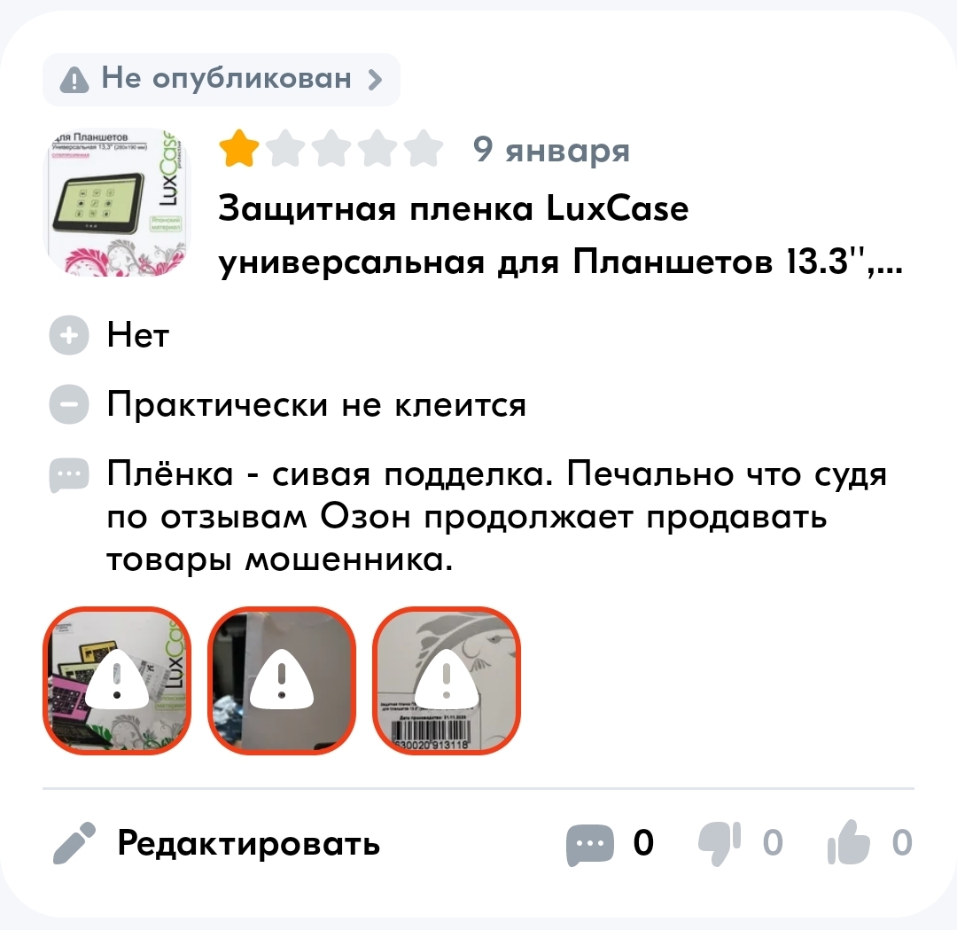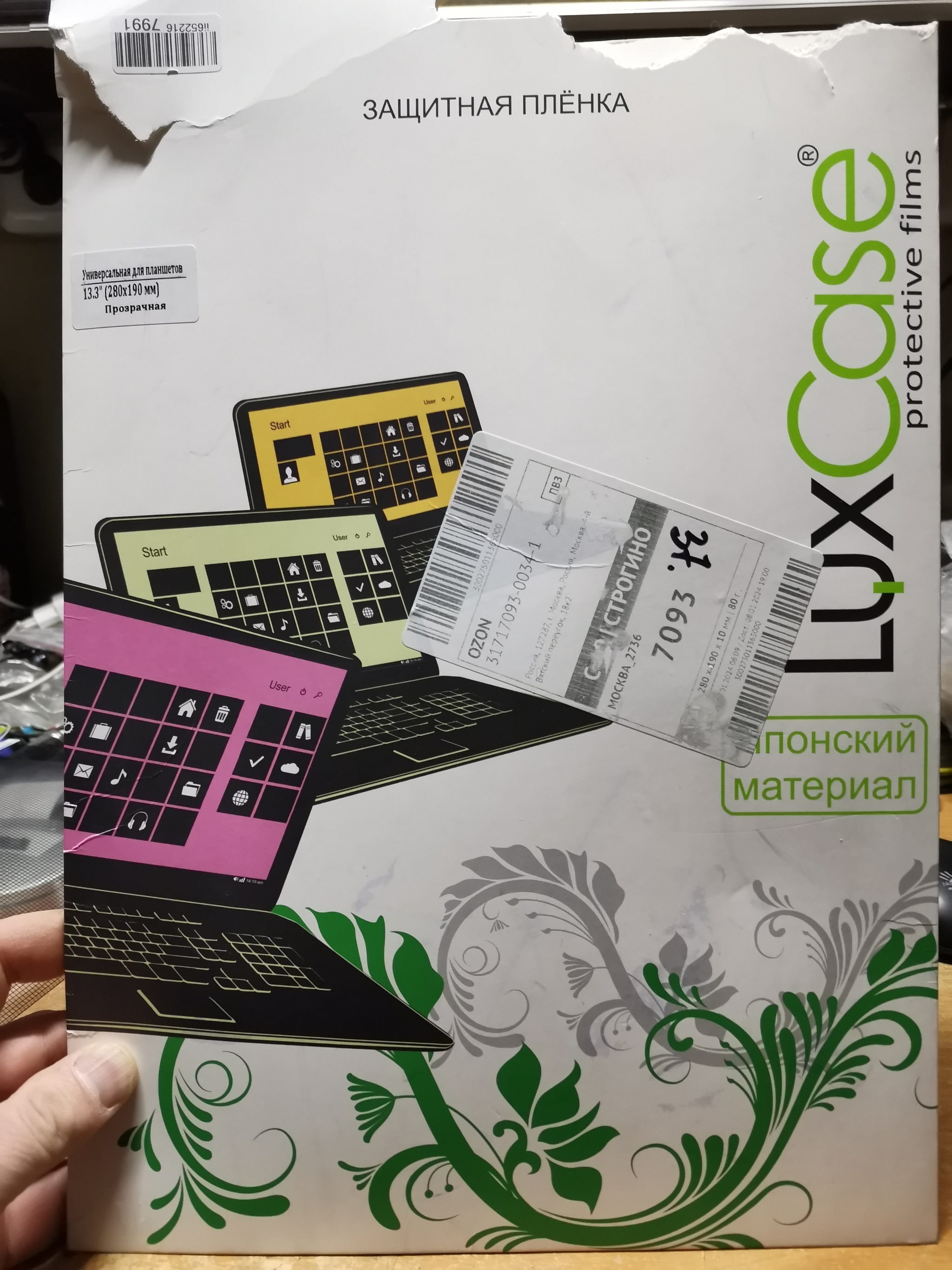 Понадобилась универсальная защитная плёнка для планшетов, заменить на дверце микроволновки. Нужна срочно, ибо скоро уезжать на долго, а микроволновкой будут пользоваться. Нашёл на Озоне плёнку от LuxCase с доставкой в пункт выдачи прям завтра. Да ещё и суперпрозрачная. Вообще отлично, лучше будет видно продукты в микроволновке, и как раз успею заменить перед отъездом. Прихожу забирать, а упаковка вскрыта. Ладно, думаю, главное что сама плёнка внутри есть. Хрен бы на эти украденные салфетки-стикеры, они всё равно мне не надо. И только дома уже заметил, что мало того, что плёнка просто прозрачная, а не супер, так ещё и упаковка сильно отличается от оригинальной.
