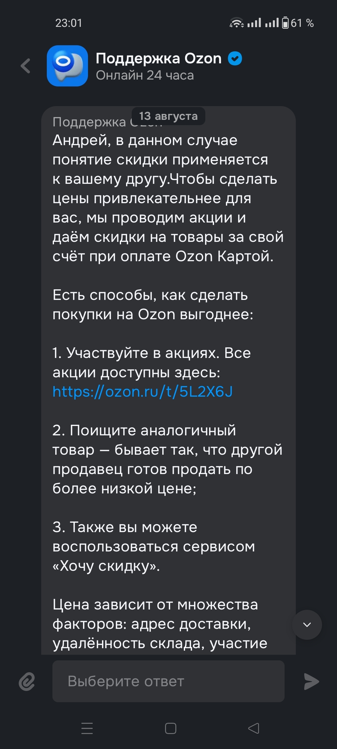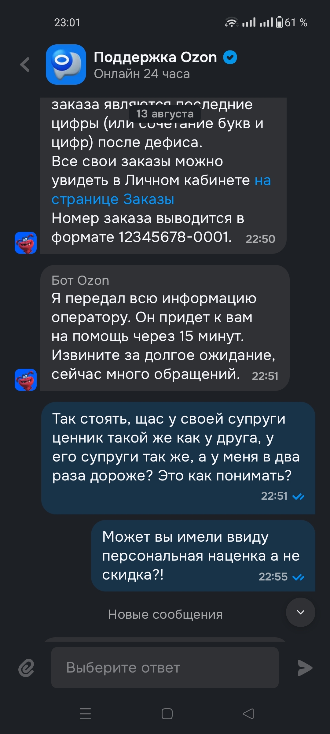 Всем доброго времени суток, сидели с другом, пивас тянули, о рыбалке разговаривали, щука пошла, уговаривает меня взять УЛ сборку, ценник показывает, вроде не плохо. В 10к вечно деревянных укладываемся, ещё и палка с катой как говорят не плохая. Скидывает ссылки чтоб в корзину закинуть, и тут мы в шоке, ценник выше просто тупо почти Х2. Ну ладно, так может глюк или ещё чего. Следующий день, открываю ссылки, все тоже самое, закидываю в корзину, все тоже самое. Пишу ему, скинь скрин что у тебя такой ценник, та дам, ценник ниже как и был. Пересылаю ссылки супруге, у нее тоже низкие цены, пересылаю людям с работы, у них тоже низкие, кореш глянул у жены, так же как и у него. И тут у меня пердак подгорел, пишу в поддержку, 2 оператора и даже разбираться ни кто не стал, 2 отписки и иди куда по дальше.