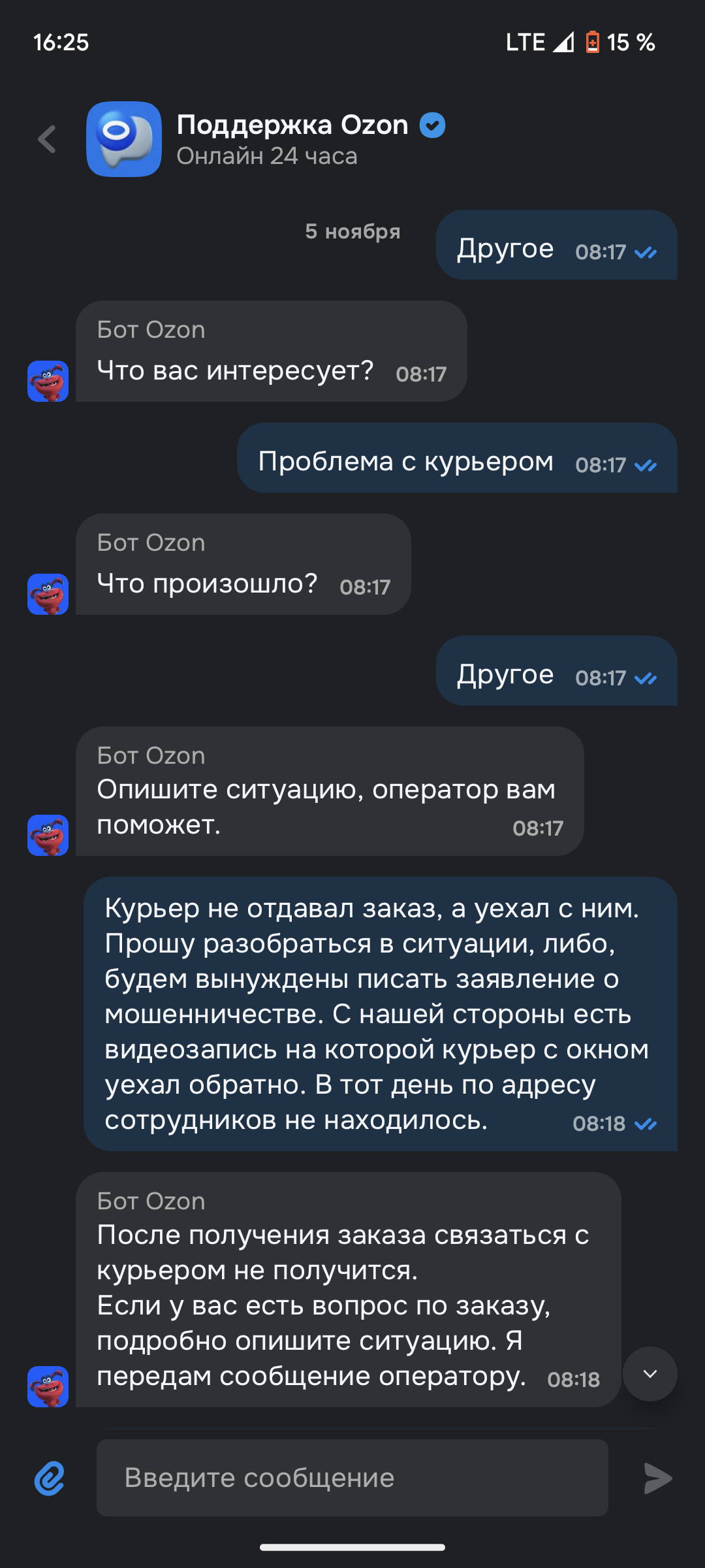 6 BRONSHS 18 часов назад Озон своровали товар Курьер приехал за день раньше до доставки, когда никого не было и уехал с товаром обратно.поддржка Ozon совершенно непробиваемая, несмотря на фото, видео и т. д. продолжают говорить что товар получен.Как с ними бороться?Пока пишем досудебку. OZON Кража Длиннопост Ещё 0
