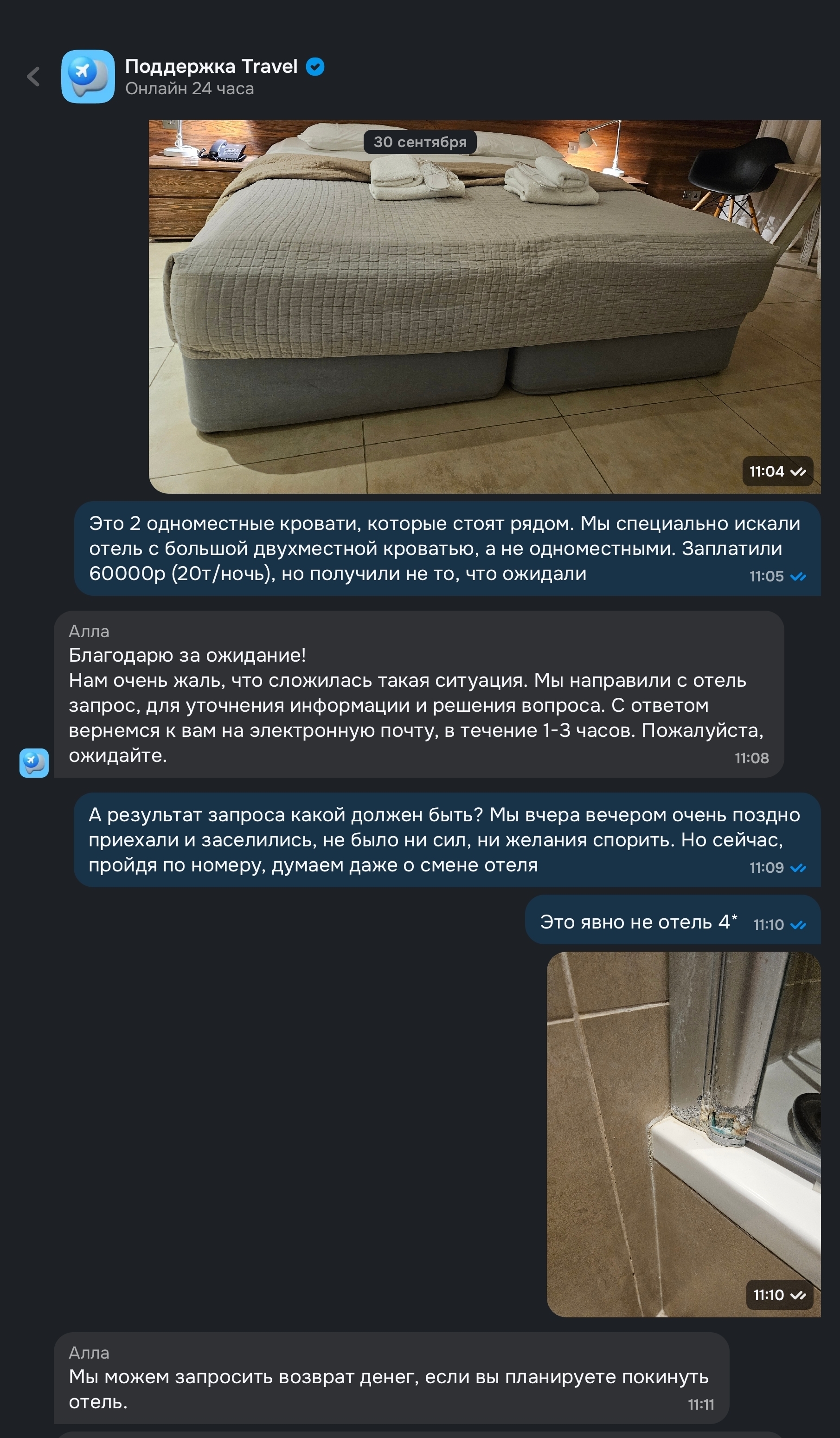 На следующее утро после заселения мы написали в Озон, указав на некорректное описание касательно двуспальной кровати, на что Озон пишет, что они готовы запросить возврат средств, если мы планируем покинуть отель.
