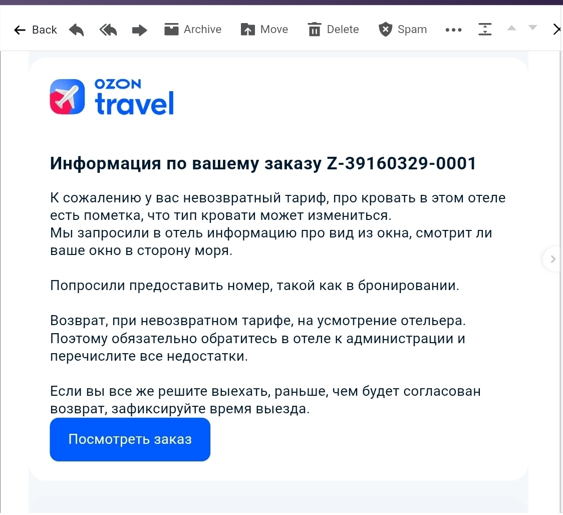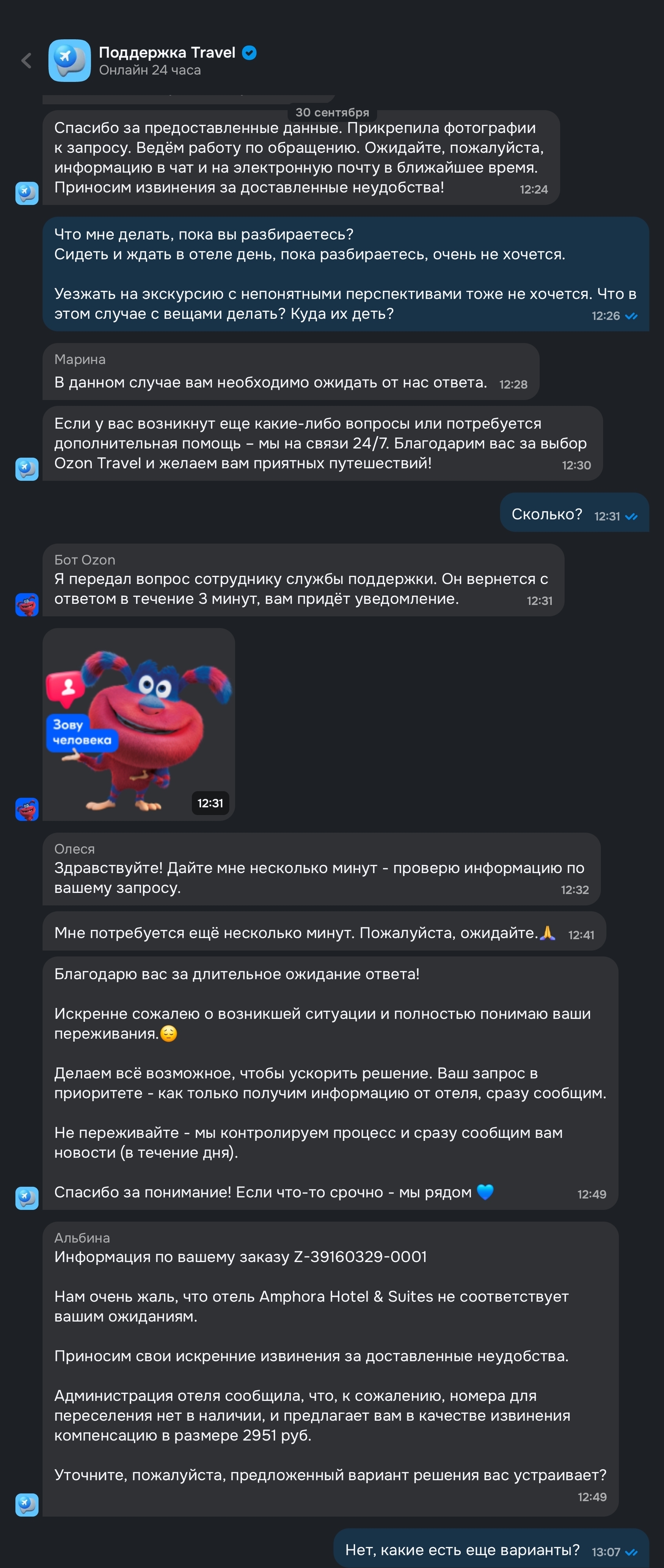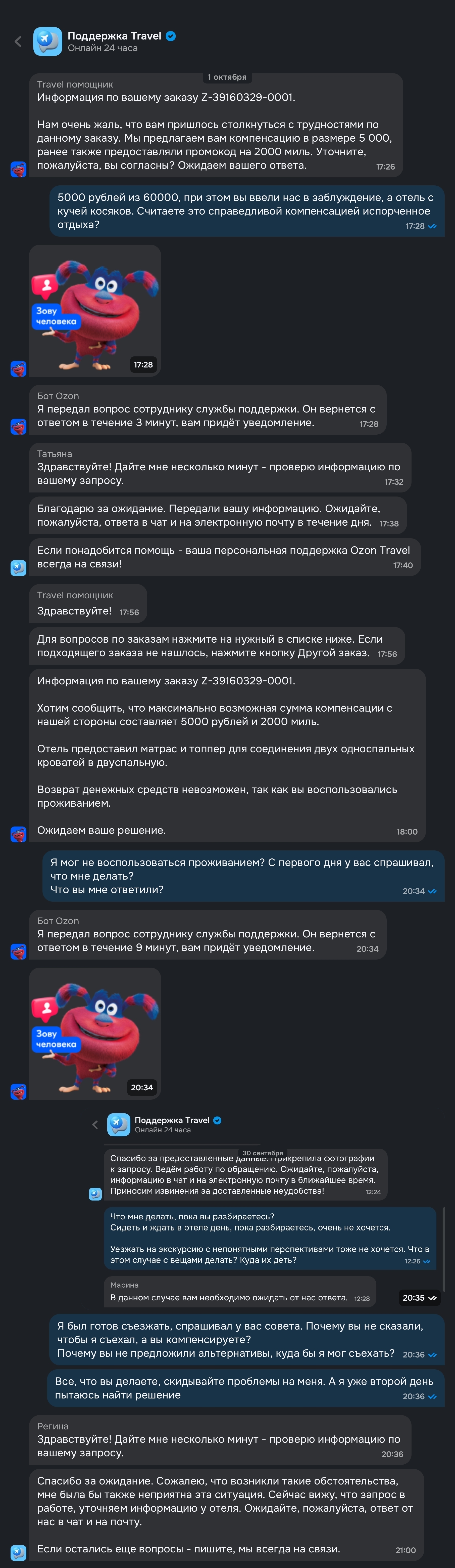 На следующий день я продолжил попытки релокации в другой отель, но это не дало абсолютно никакого позитивного результата, кроме как сваливания сотрудниками Озон вины на меня: