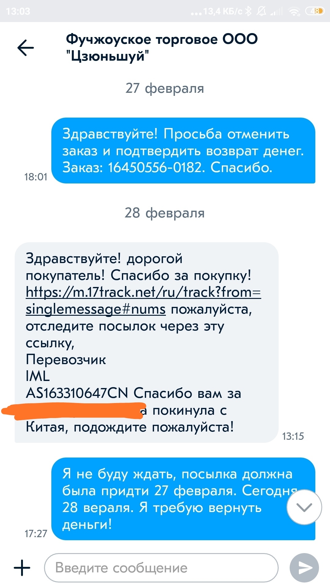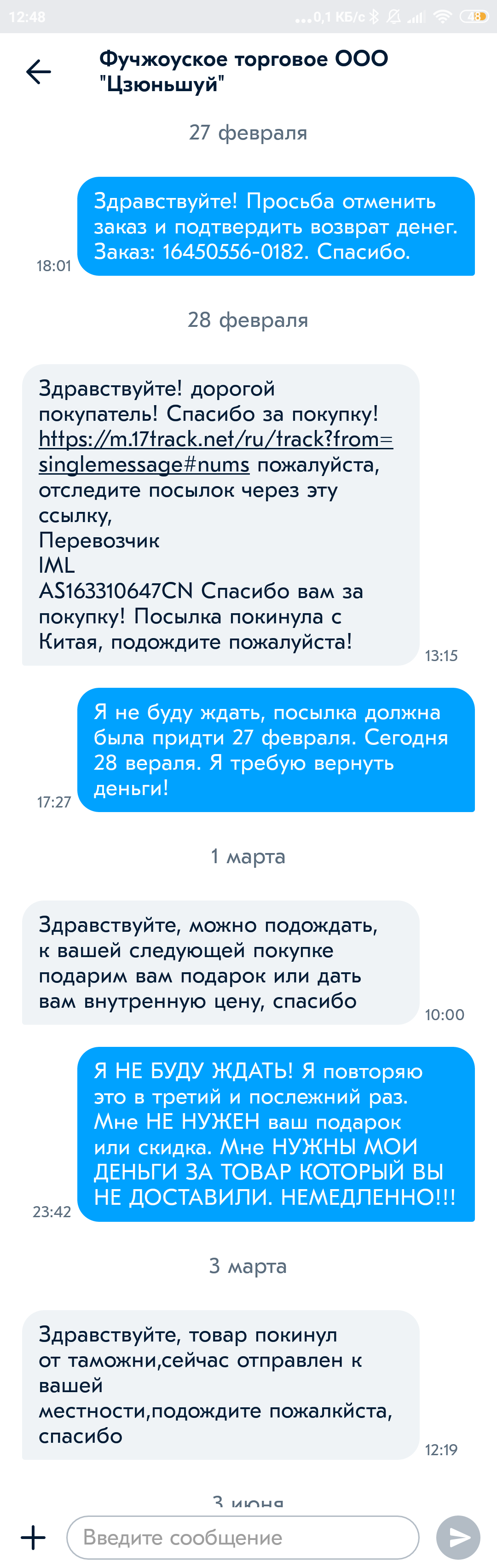 Как видите, мне сначала порекомендовали обратиться к продавцу, что бы он вернул мне деньги))). Логично! Мы продали, а обращайся к китайцу.