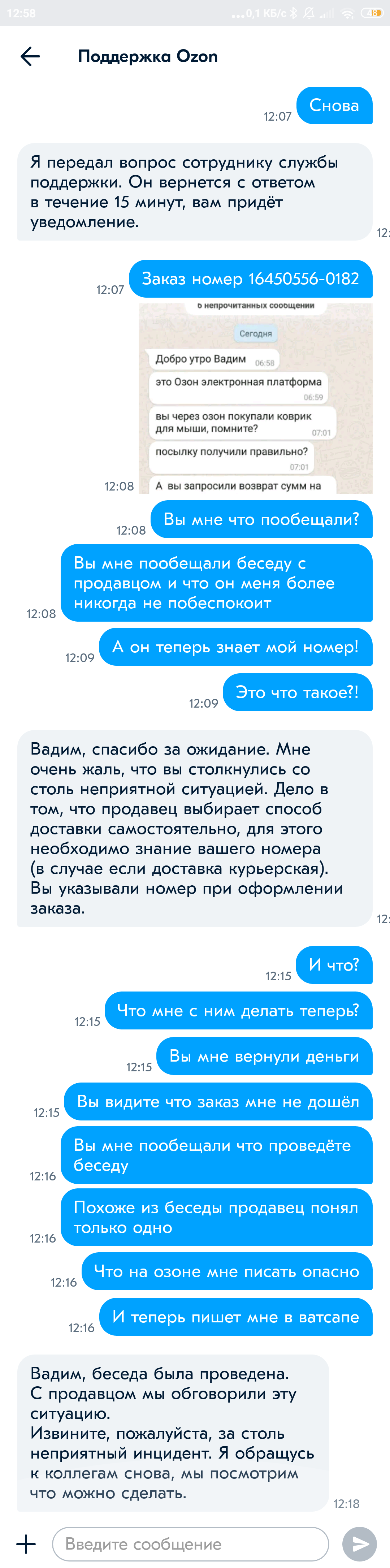 То есть они решили вопрос таким образом, что запретили ему общаться со мной через систему Озон! Но дали ему мой номер посмотреть! И теперь они вроде бы даже не при делах!)