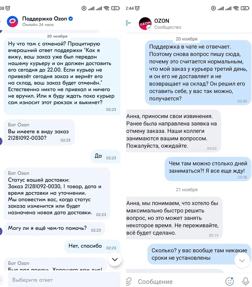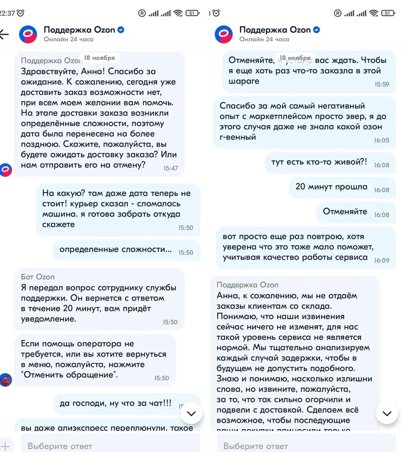 13 ноября я решила заказать рюкзак для запланированной на 22-е поездку. Доставка курьером была обещана на 17-е, пару дней я оставляла про запас на случай непредвиденных обстоятельств, ведь это же озон, тут редко обходится заказать без приключений. Но такое у меня впервые, хотя поверхностное гугление дало понять, что это вообще обычная практика для этой помойки. В статусе заказа 17-го числа, товар был уже у курьера, я не беспокоилась. Но в 22 часа по МСК мне пришло оповещение, что доставка перенесена аж на 19-е. Тут я напряглась. Зашла в заказ и поменяла дату на 18-е. Написала в поддержку и курьеру, т.к. его телефон был указан в информации о заказе. Утром 18-го пришло голосовое от курьера, что машина сломана, и он не мог доставить заказ ни вчера, ни сегодня (18-го), и вообще не знает, когда. К вечеру конкретная дата доставки в статусе пропала, а появилась: "сроки уточняются"