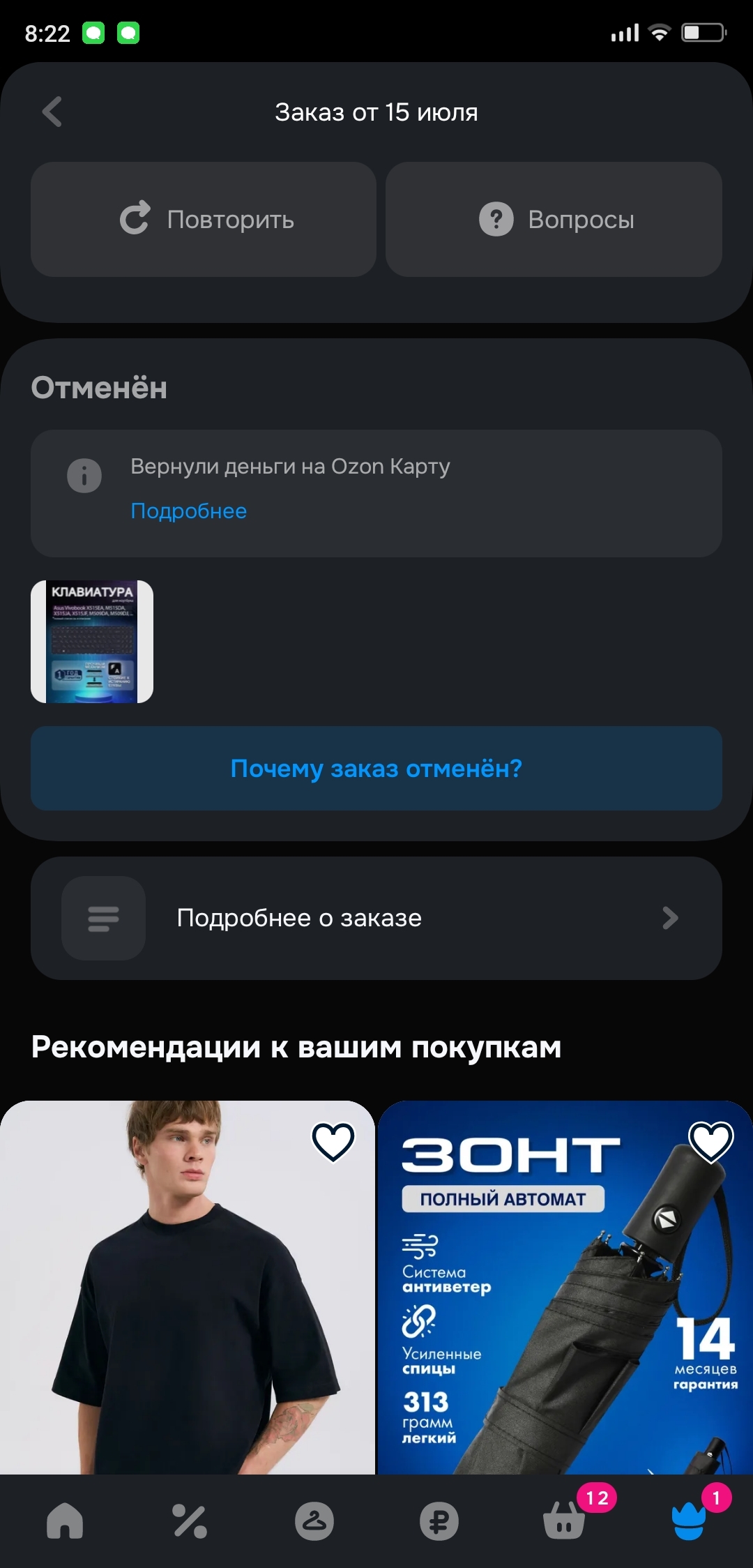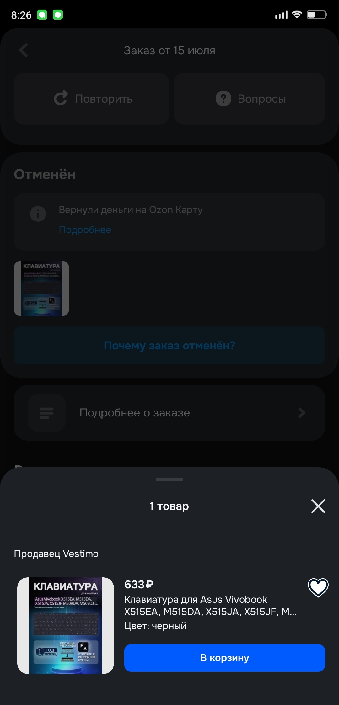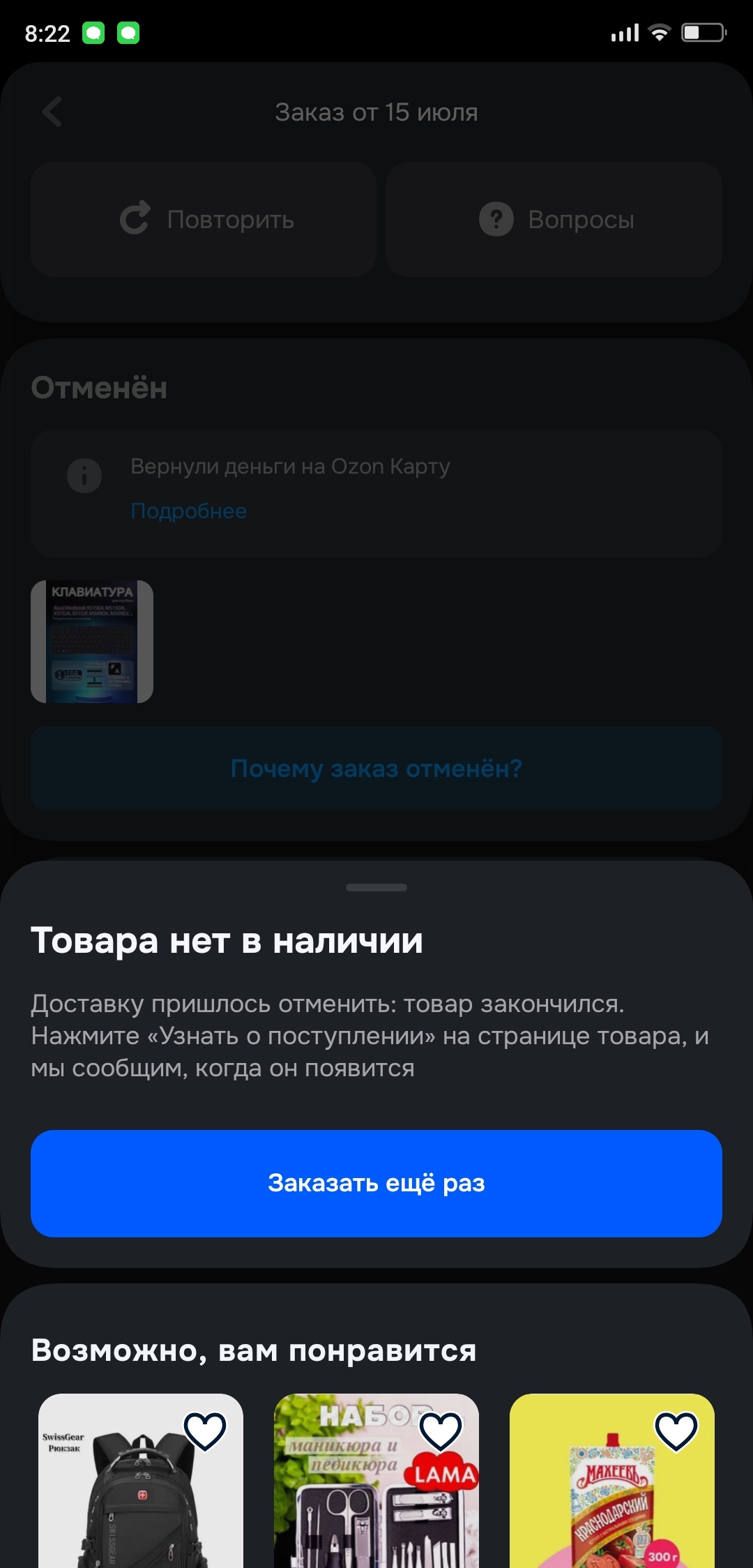 Сегодня утром обнаруживаю, что мой заказ 51540968-0174 с клавиатурой отмененён с формулировкой "Товара нет в наличии", однако если перейти в карточку товара, то он там есть. @Ozon, это как называется???? Лень ваших сотрудников????