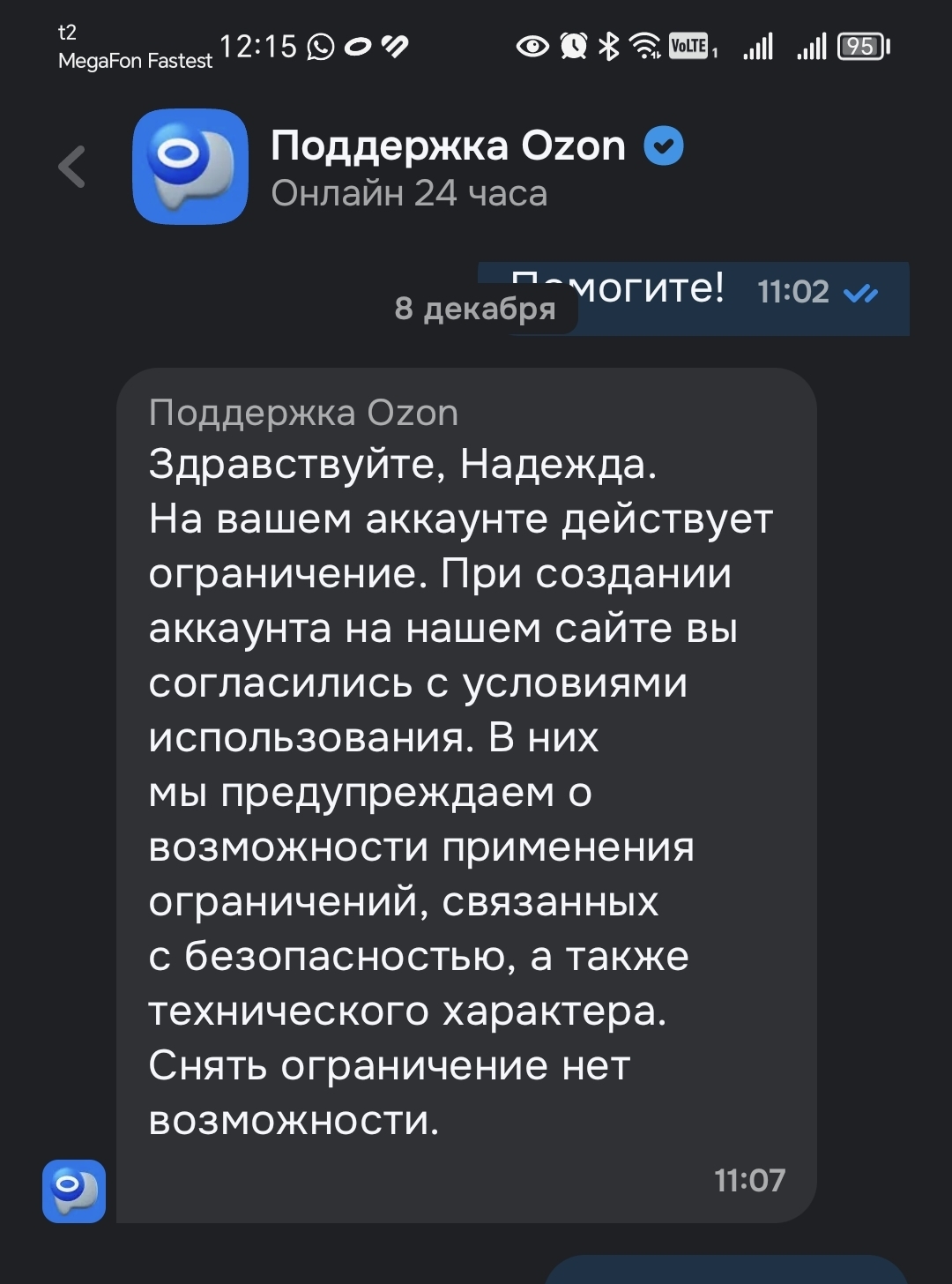 Мои отзывы ничего не нарушали.хочу в дальнейшем пользоваться @Ozon, без ограничения действий, т.к маркетплейс действительно удобный. Тем более моей вины в этом абсолютно нет