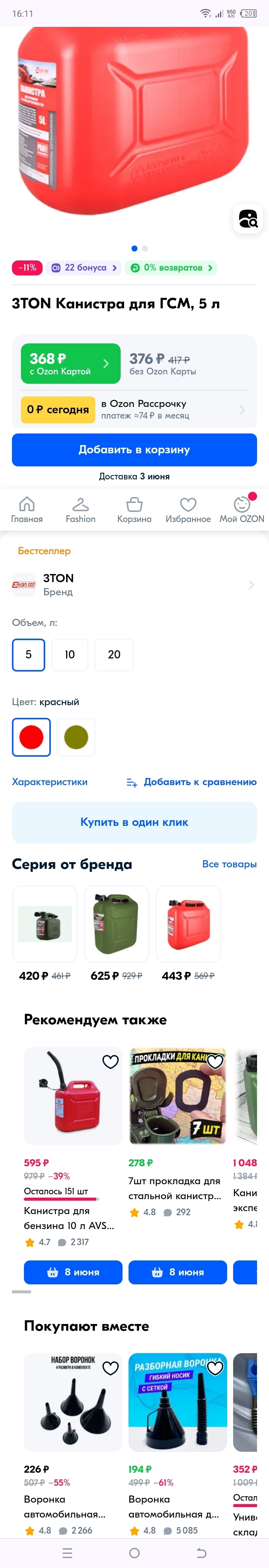 P.P.S. А у вас сколько стоит эта канистра, которая без озон карты для меня обойдется в 499 рублей? https://www.ozon.ru/product/3ton-kanistra-dlya-gsm-5-l-96253...