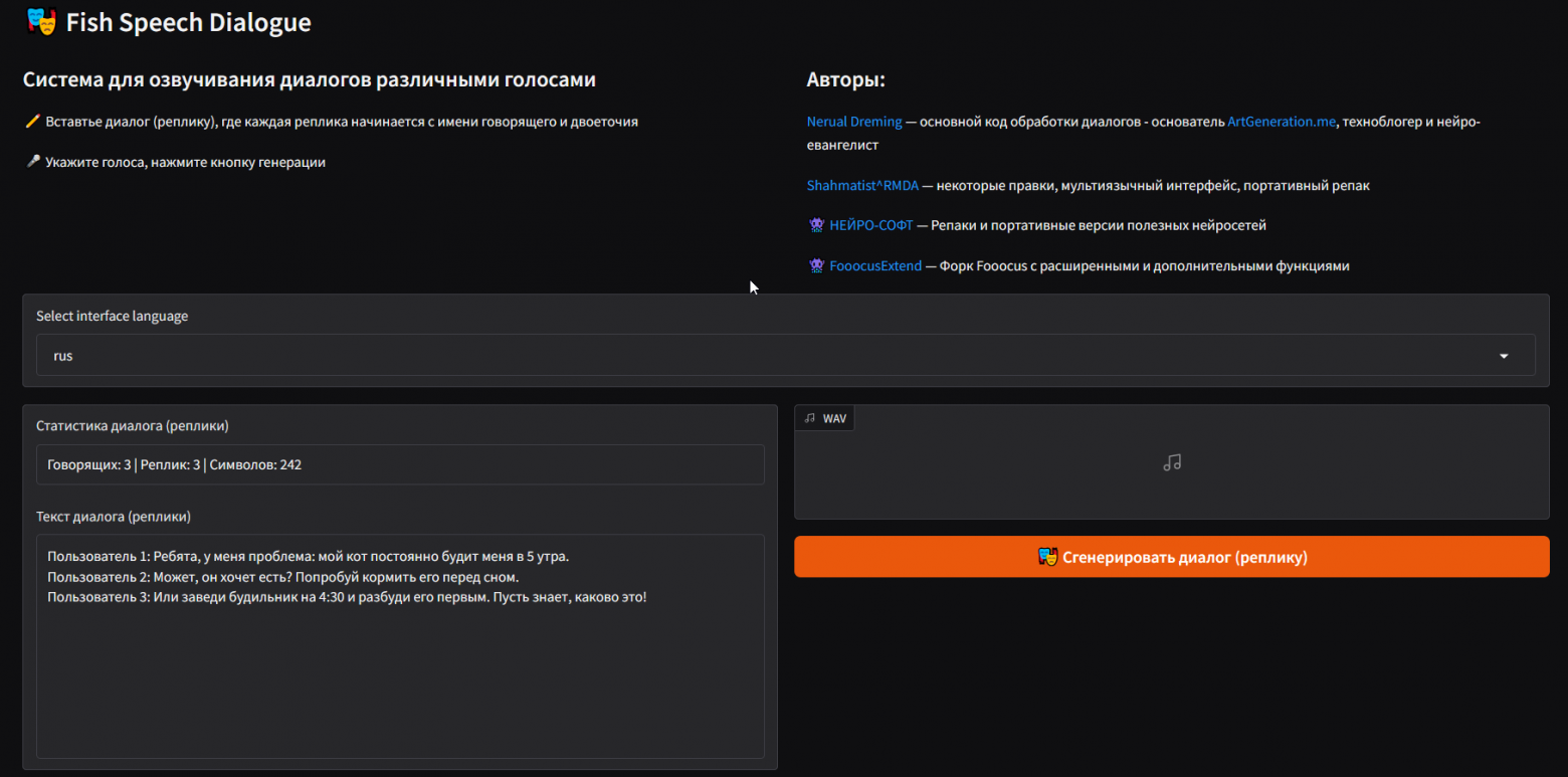 Fish Speech Dialogue — современный инструмент для озвучивания диалогов и реплик с использованием разнообразных голосов.