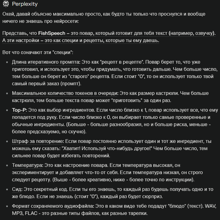Честно, расширенные параметры я не щупал, меня интересовал лишь принцип работы и результаты. Но я попросил ассистента Perplexity пояснить, что это, кому интересно, вот выжимка: