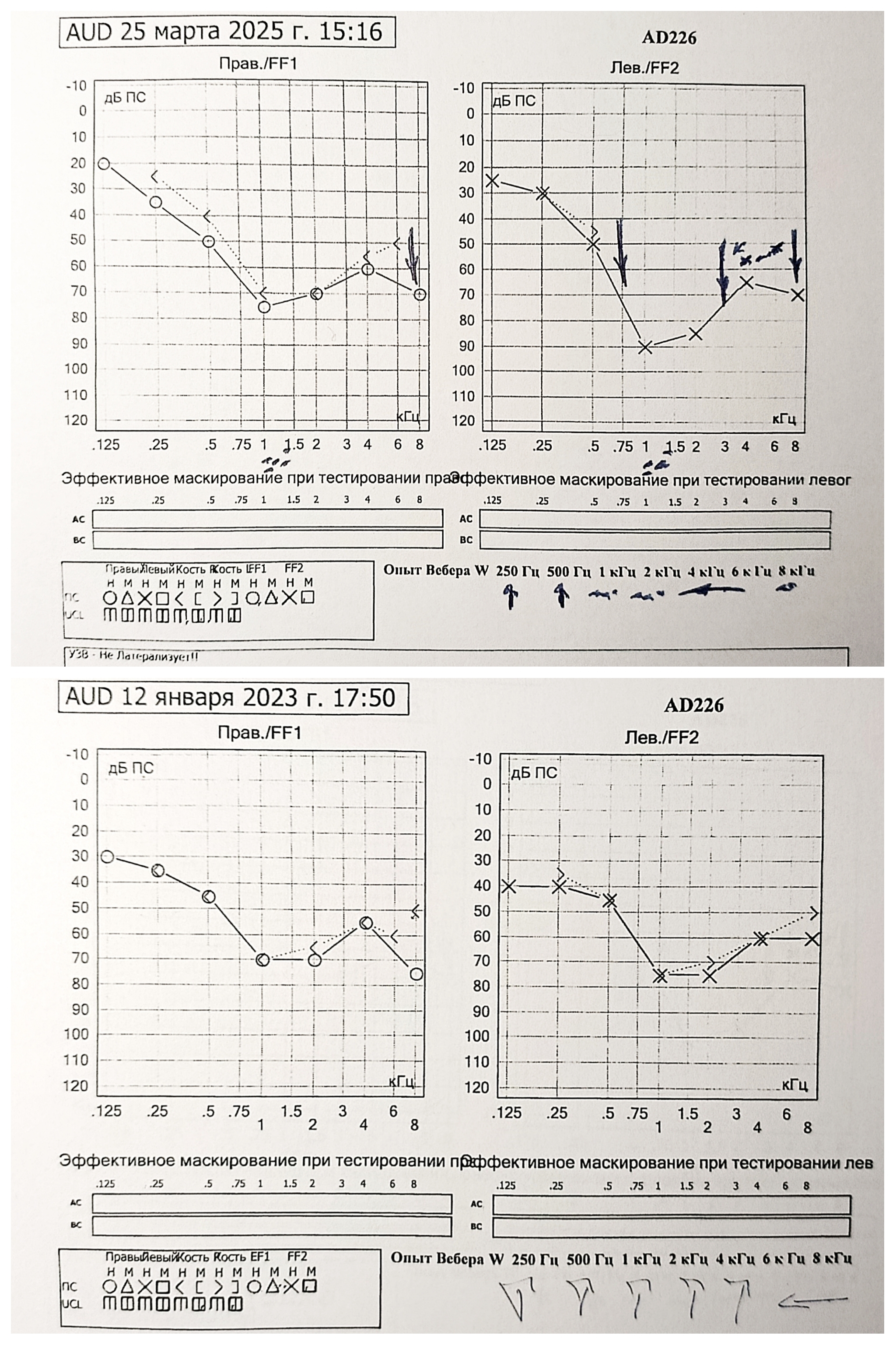Суть заливных наушников заключается в том, что динамик находится глубоко внутри уха, очень близко к барабанным перепонкам. И это самый популярный вид наушников для использования в качестве индивидуального мониторинга музыкантами. Самый популярный. И самый опасный. Динамик располагается очень близко, и если сделать звук громким... Я поняла ошибку быстро, прошел всего месяц или два. Это сколько, четыре, восемь репетиций? Сначала я чувствовала усталость и боль в ухе (я использовала монитор только в левом, в нем звучал мой вокал, правым ухом я слушала других музыкантов), потом начала замечать ухудшение слуха и смещение панорамы звука вправо. Я сразу перестала пользоваться наушниками, но потеря слуха на левом ухе уже составила дополнительные 15 децибел... И из третьей степени образовалась четвертая - пик минус 90 децибел вместо 75 на предыдущей аудиограмме. Вот такая вот цена за "сделать гитары погромче".