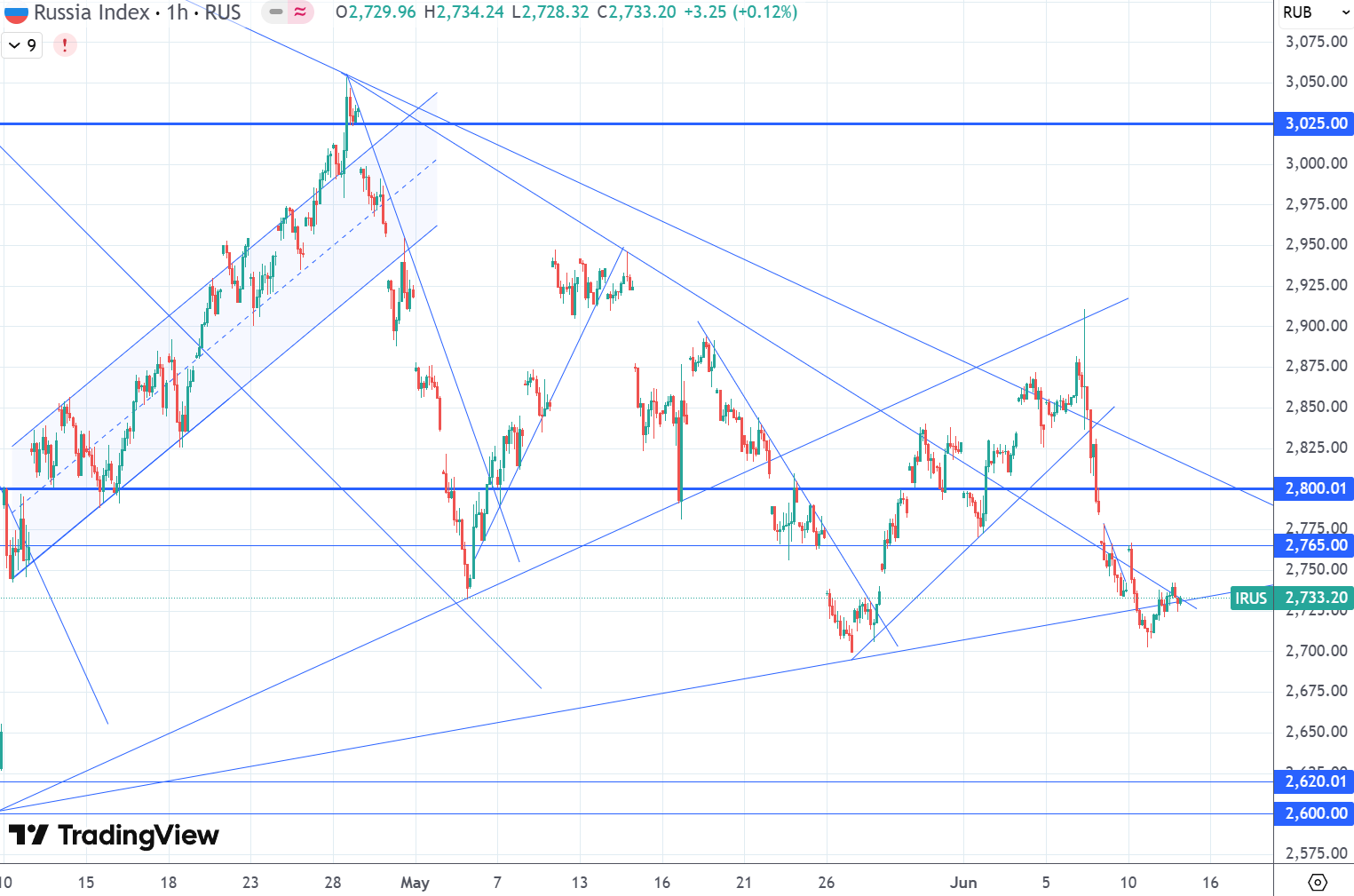 В итоге индекс пробил уровень 2800 и упал к уровню 2765, от которого технически рынок уже мог отскочить обратно к 2800. Однако довольно быстро в понедельник и уровень 2765 был пробит, после чего падение ускорилось в сторону линии глобального аптренда, о возможности чего так же писал в предыдущем обзоре в случае пробоя 2765.