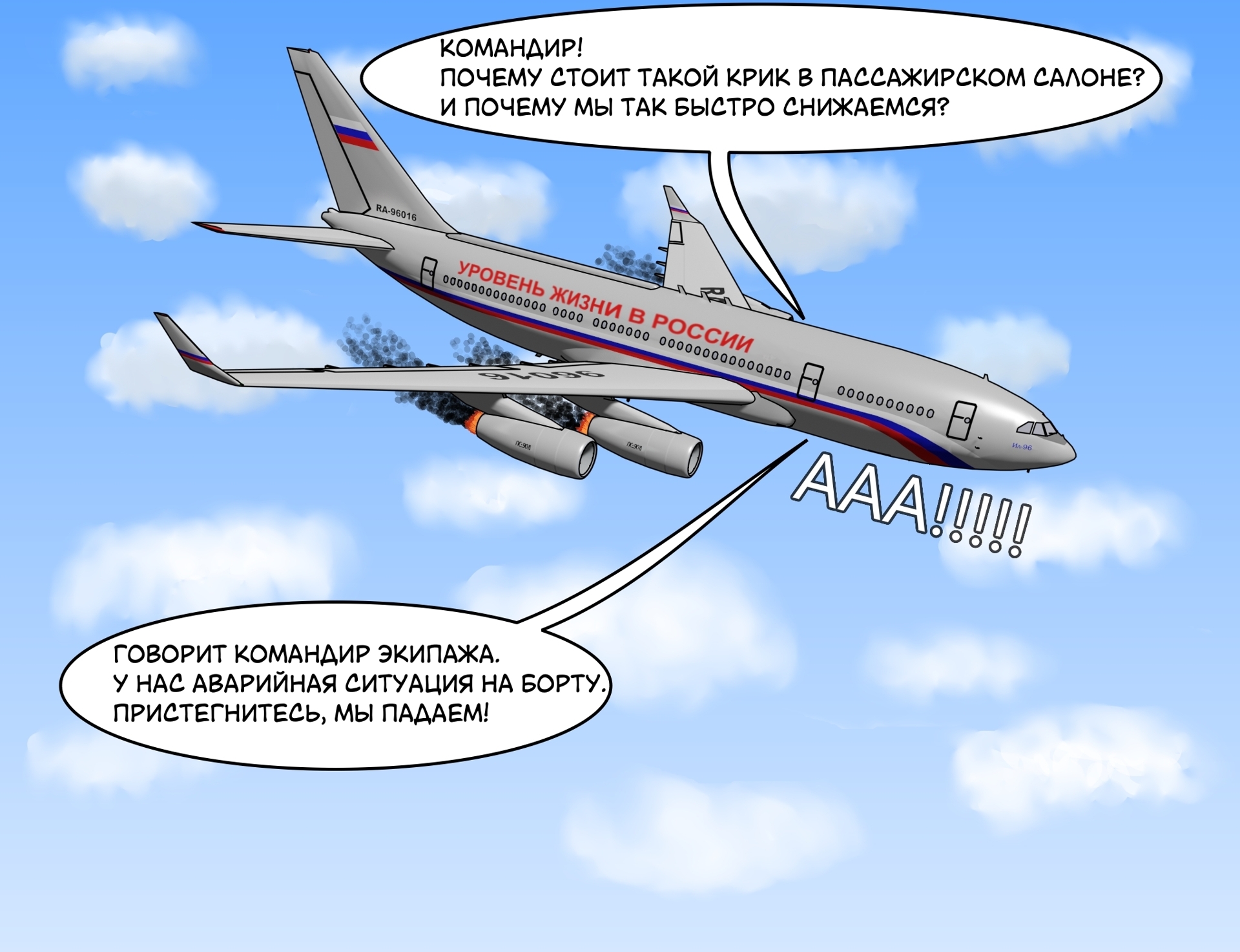 Этот комикс-карикатура (сам нарисовал) - вариация на тему известного мема «пристегнитесь, мы падаем». Он про то, что в России уровень жизни продолжает уверенно падать. И если в столице России, крупных городах-миллионниках, и регионах, где добывают нефть это не очень заметно. То в остальной России заметно и ещё как.