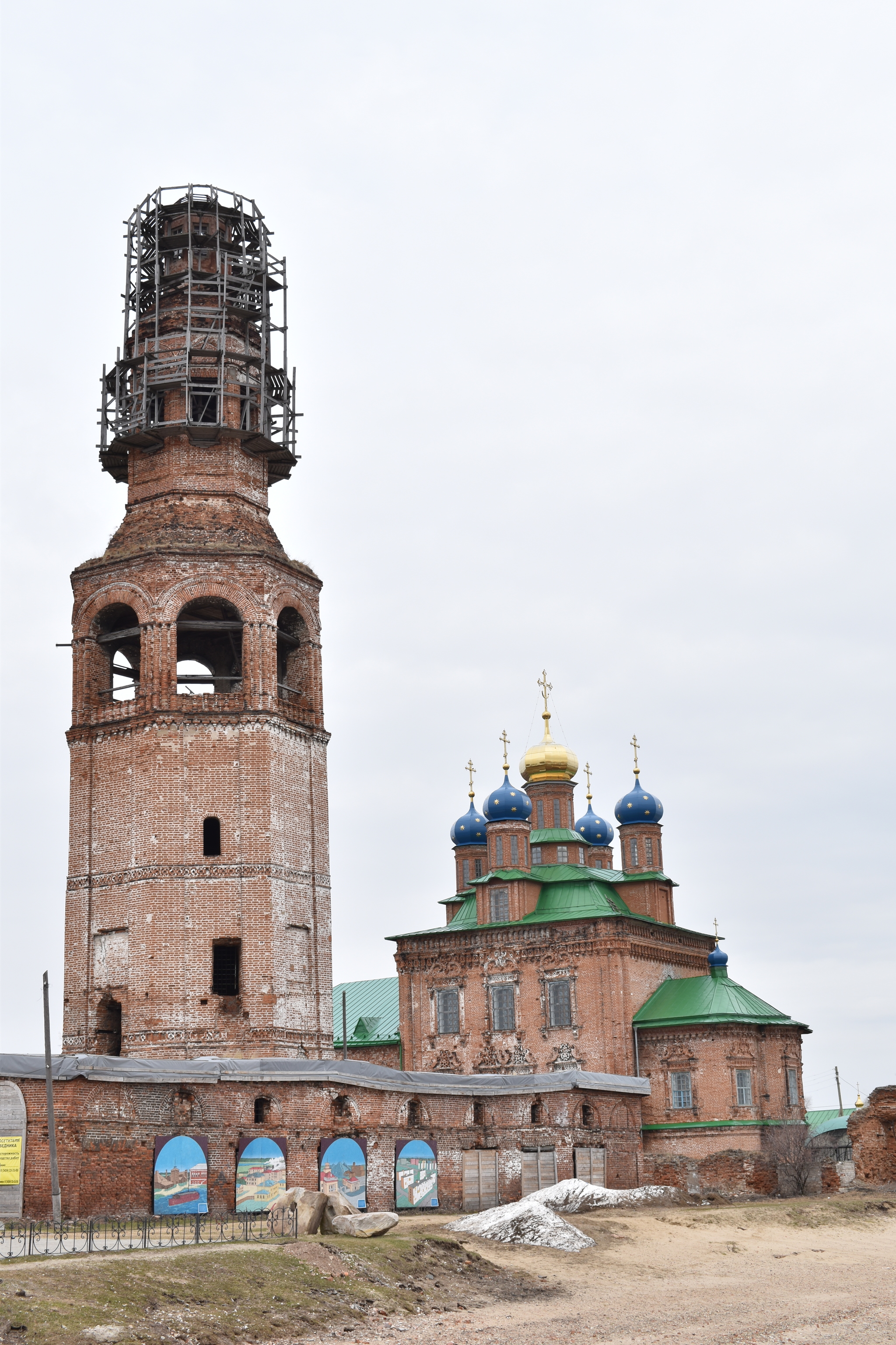 Соборная колокольня, стоит с наклоном, строительные леса уже почернели: