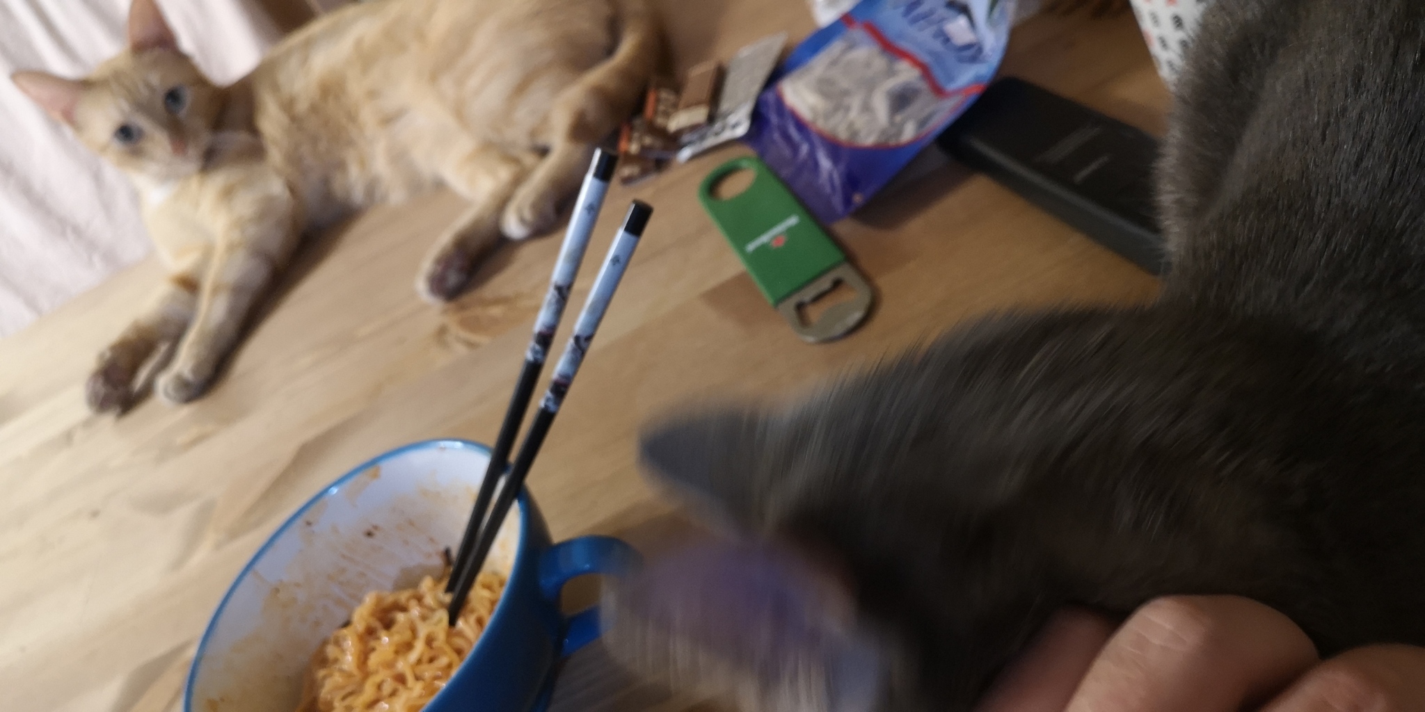 Кот обескуражен не меньше моего. Открываем, смотрим. Помимо брикет лапши в упаковке лежит достаточно объёмный пакетик с соусом. Вот и вся комплектация.