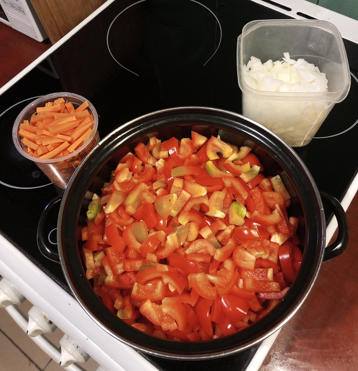 Добавляем морковь и перец, пассеруем до размягчения. В процессе сдабриваем столовой ложкой паприки.