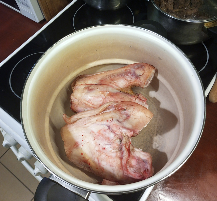 Затем вынимаем суставы и срезаем с них всё, что сможем. Полученная субстанция кому-то может показаться неприглядной, на самом же деле это соединительная ткань, состоящая в основном из коллагена, эластина и ретикулина. Кроме того, что коллаген полезен для суставов и костей (погуглите, например, «студень польза употребления»), он ещё и вкусен.