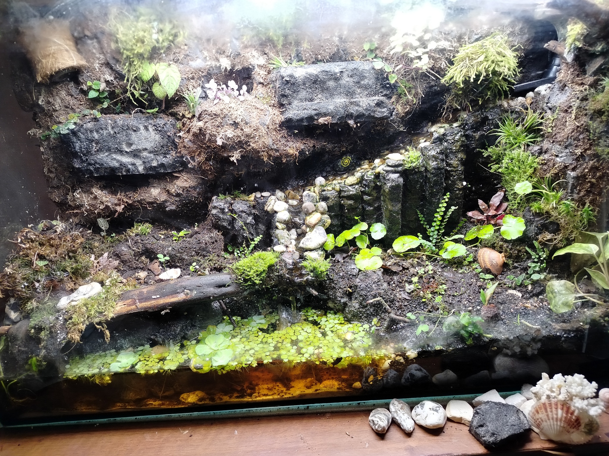 Что такое палюдариум? Для тех, кто не знает – это гибрид аквариума, флорариума и террариума, место за стеклом, где есть суша, на которой растут растения, могут жить некоторые животные, но также и вода, в которой могут жить рыбы, креветки, лягушки (в зависимости от объема).