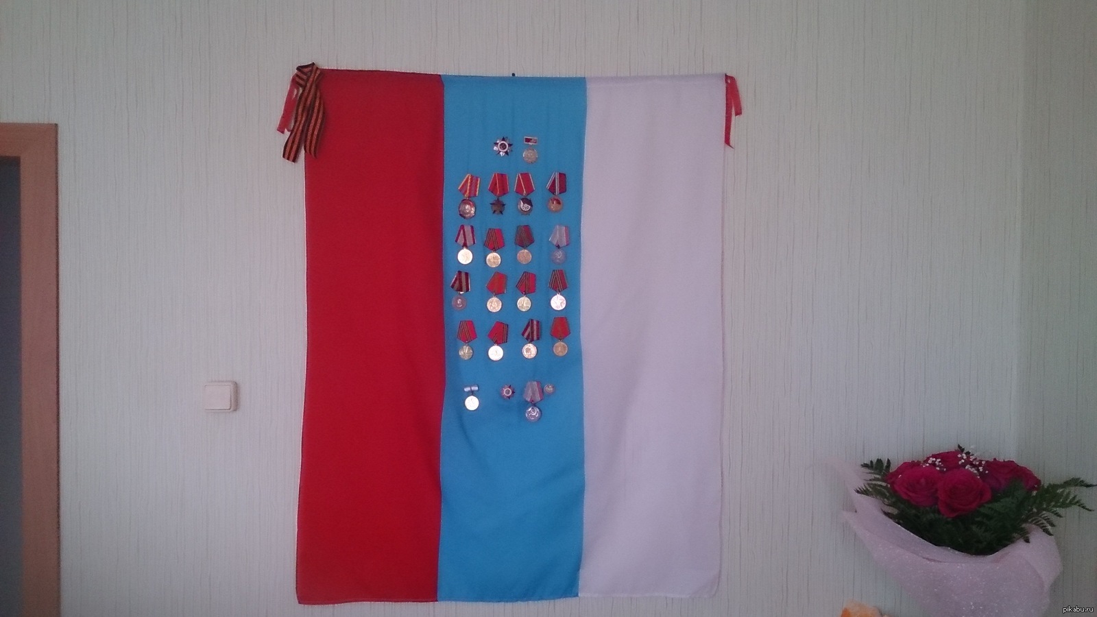 Мой дед был ветераном Великой Отечественной Войны. Его уже 4 года как нет. Каждый год на 9 мая я вешаю флаг с дедовскими медалями.