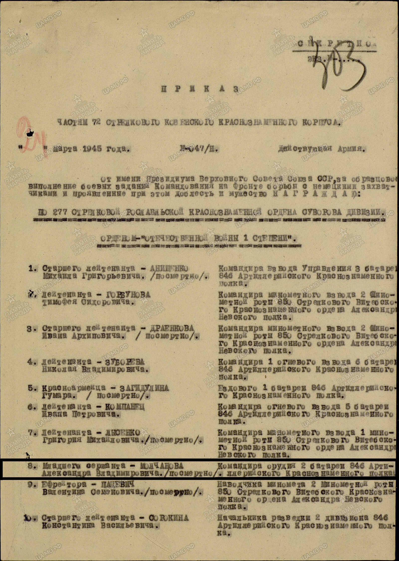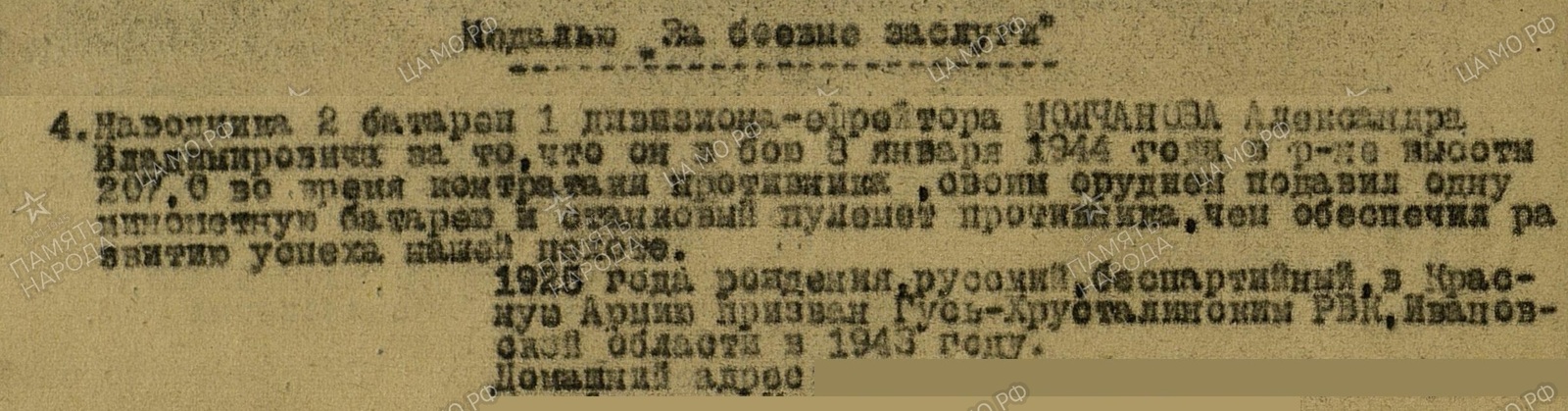 Проведенное в время за компьютером в тот вечер дало результат, даже больший чем я ожидал. Сначала по ФИО и городу я нашел именно того Молчанова Александра который был моим дедом. Просмотрел его боевой путь.