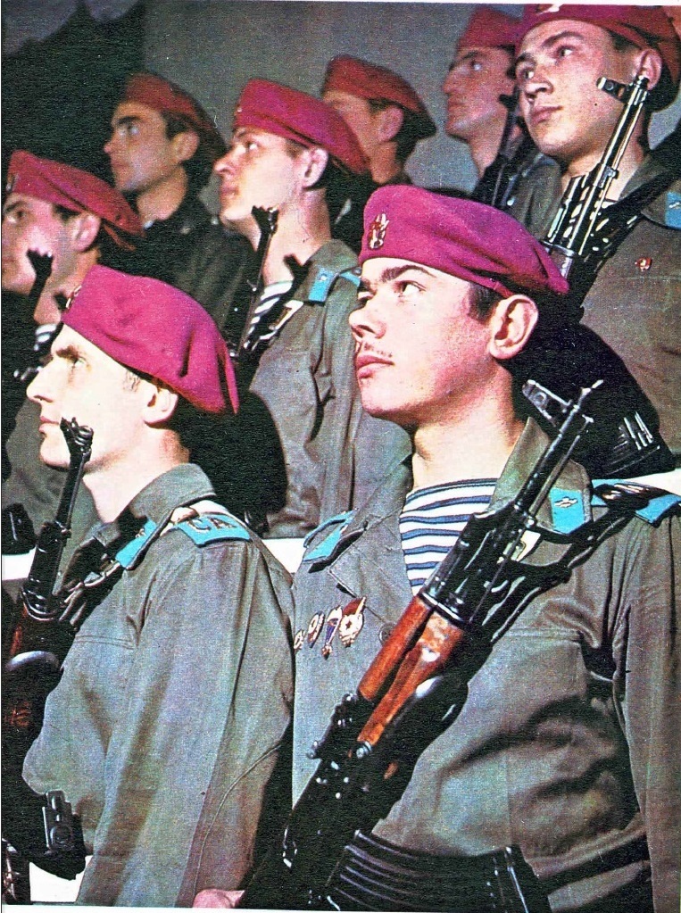 Малиновые береты войска ВДВ получили в августе-сентябре 1967 года. 7 ноября 1967 года был проведен парад, посвященный годовщине революции, на котором воздушно-десантные войска впервые прошли в новой форме и малиновых беретах. Но этот вариант видимо не понравился первым лицам государства, и уже в начале 1968 года малиновые береты были заменены на голубые, поскольку голубой цвет символизировал небо и больше подходил парашютным подразделениям. В августе 1968 года при вводе частей в Чехословакию десантники были уже в беретах голубого цвета.
