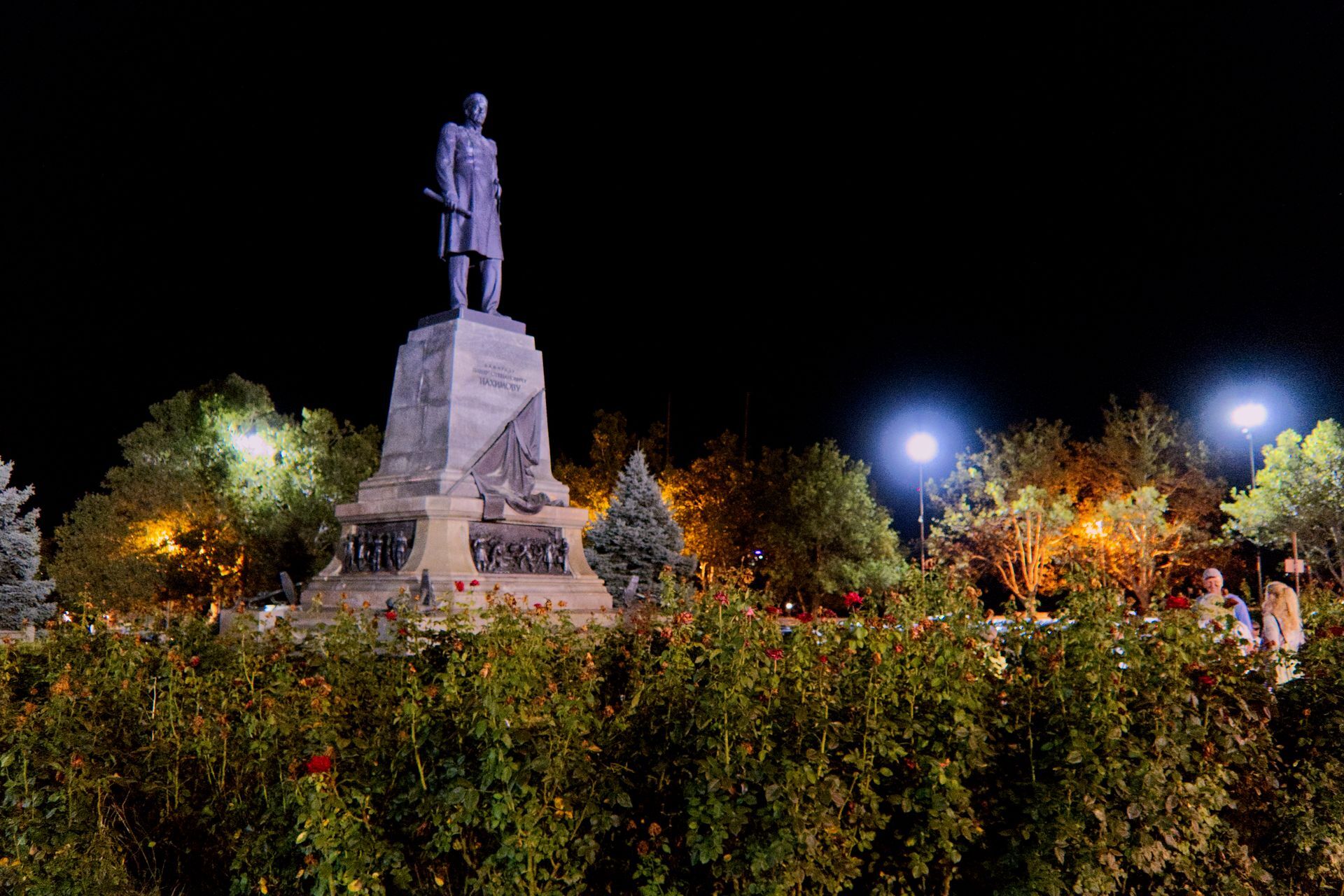 На фотографии выше можно увидеть как выглядит памятник Нахимову ночью.
