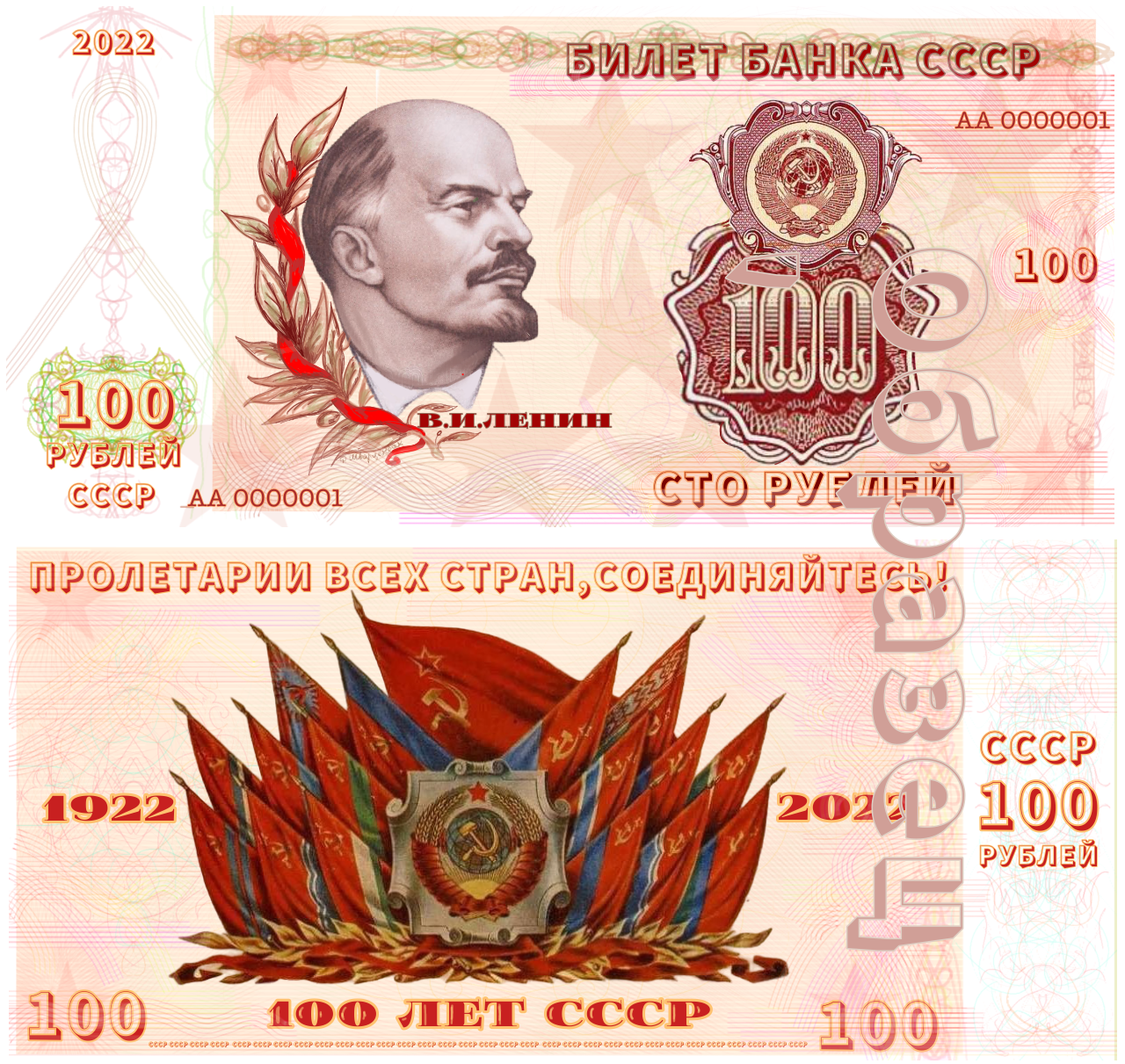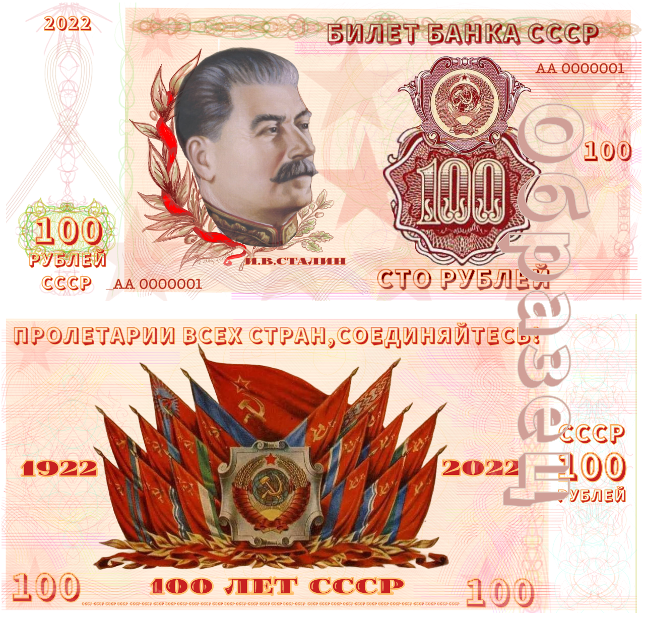 Я ранее занимался коллекционированием монет и марок. Недавно побывал на слёте местных коллекционеров и там мы разговорились о том, что к 100-летию образования СССР не выпущено никакого официального коллекционного материала, например марок или банкнот, про монеты со значками и говорить не стоит. Ну вот я и решил как художник поэкспериментировать над тем, как могли бы выглядеть юбилейные банкноты. Пока с Лениным и Сталиным, в планах ещё Дзержинский, Брежнев и Курчатов….с разными номиналами. Вот что у меня получилось. Можно попробовать напечатать в типографии на бумаге с водяными знаками, думаю, выйдет красиво.