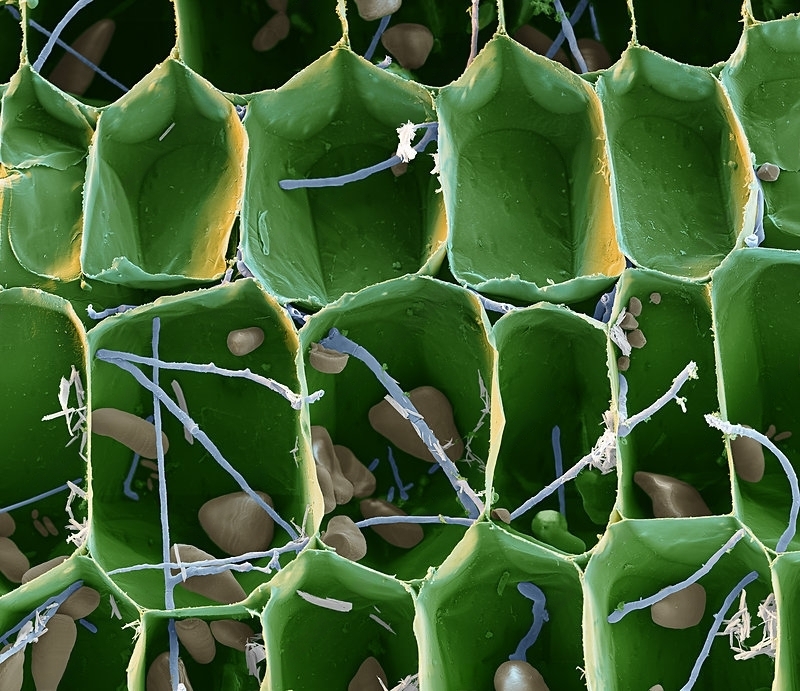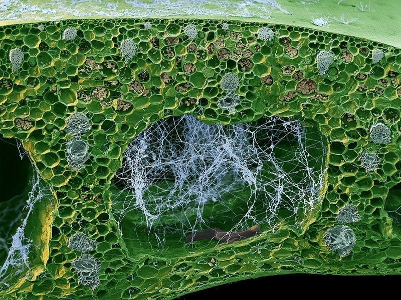 Нити гриба внутри клеток листа. Увеличение х750. Сканирующий электронный микроскоп. "Камешки" внутри клеток - это зёрна крахмала.
