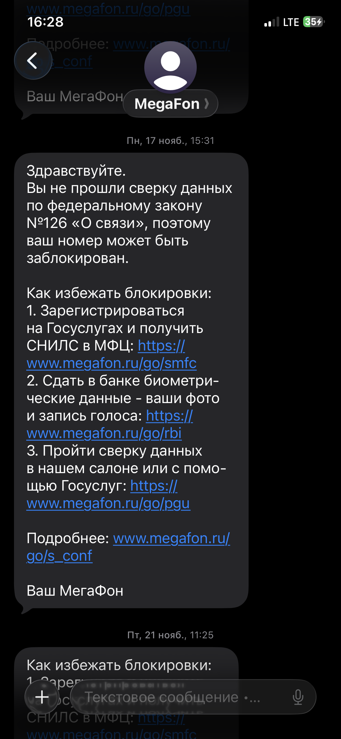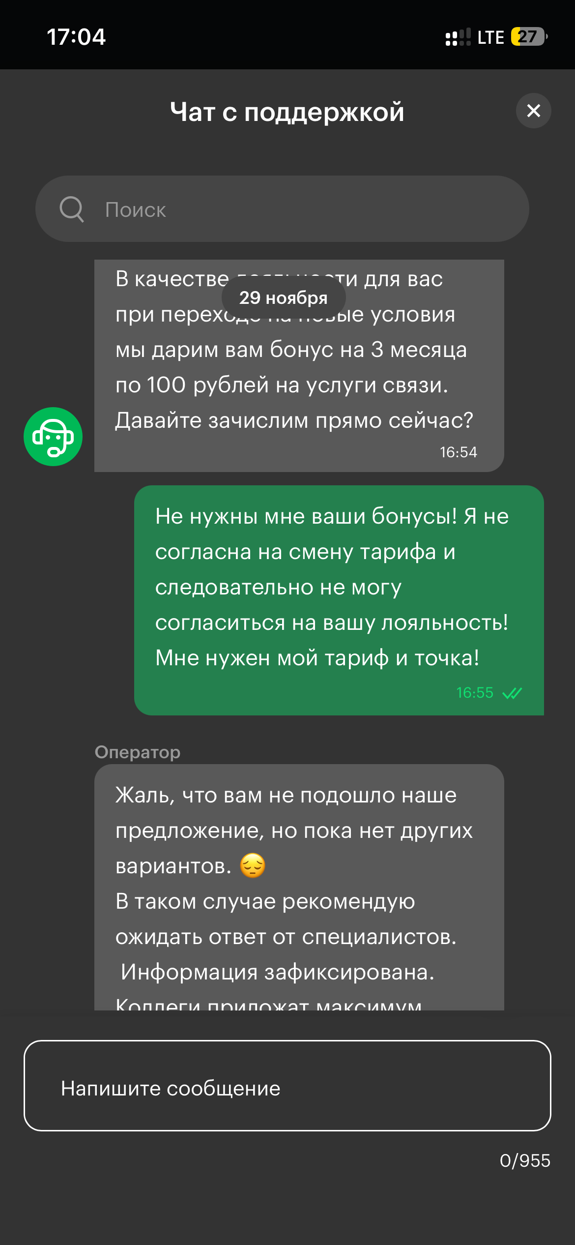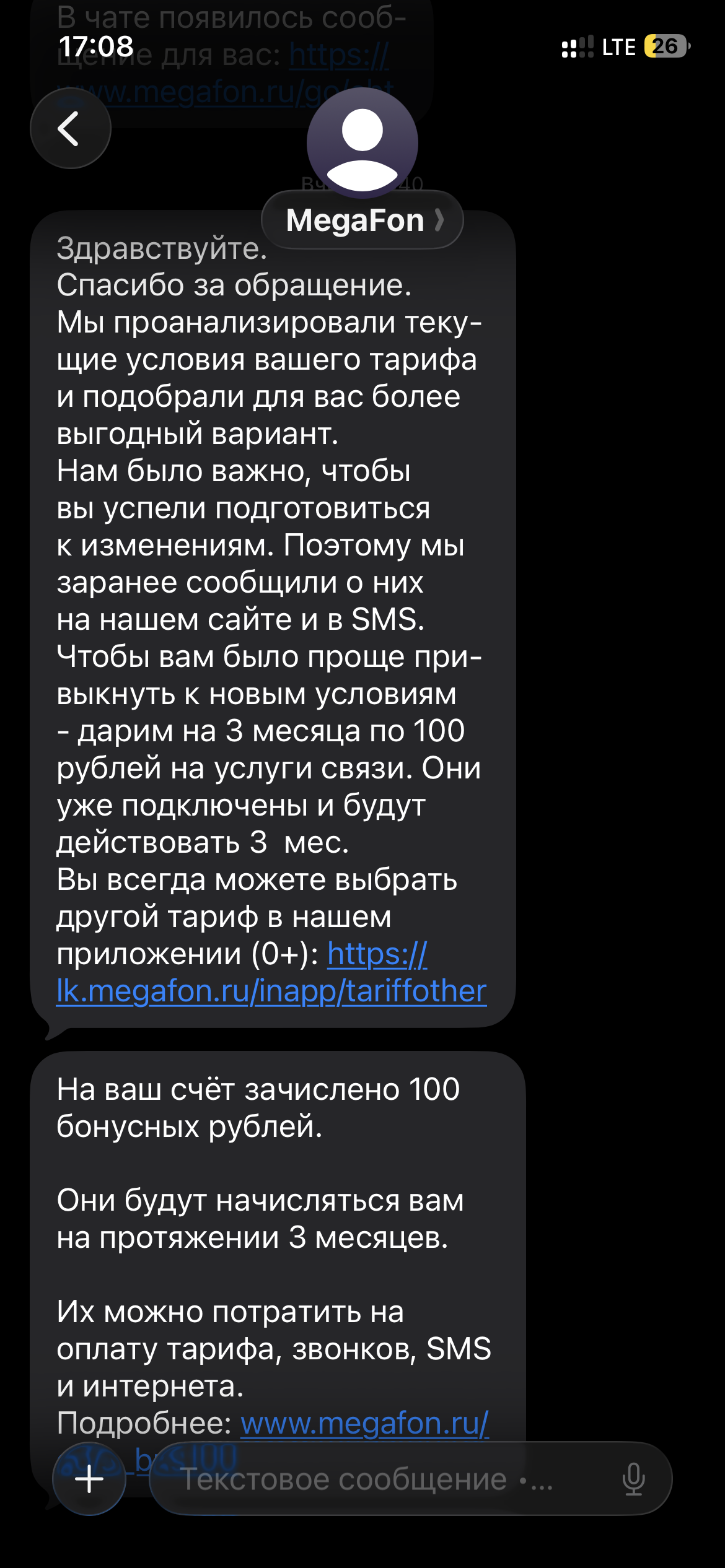 Добрый день всем! Хочу поделиться очередной историей наглого поведения оператора связи Мегафон в отношении клиентов. Вчера, 29.11.2025 я узнала, что условия моего тарифа будут изменены начиная со следующего месяца. Плата теперь будет составлять 474 р вместо 375 р. При этом моя персональная услуга «безлимитный интернет» теперь становиться отдельной и стоить она будет 99 р в месяц. И безлимит на раздачу интернета я тоже теряю при смене условий тарифа. Я написала в поддержку где меня стали уверять, что я была проинформирована об этом в смс сообщении 17.10.2025, я пролистала все сообщения до той даты и с удивлением обнаружила, что такого сообщения не поступало!