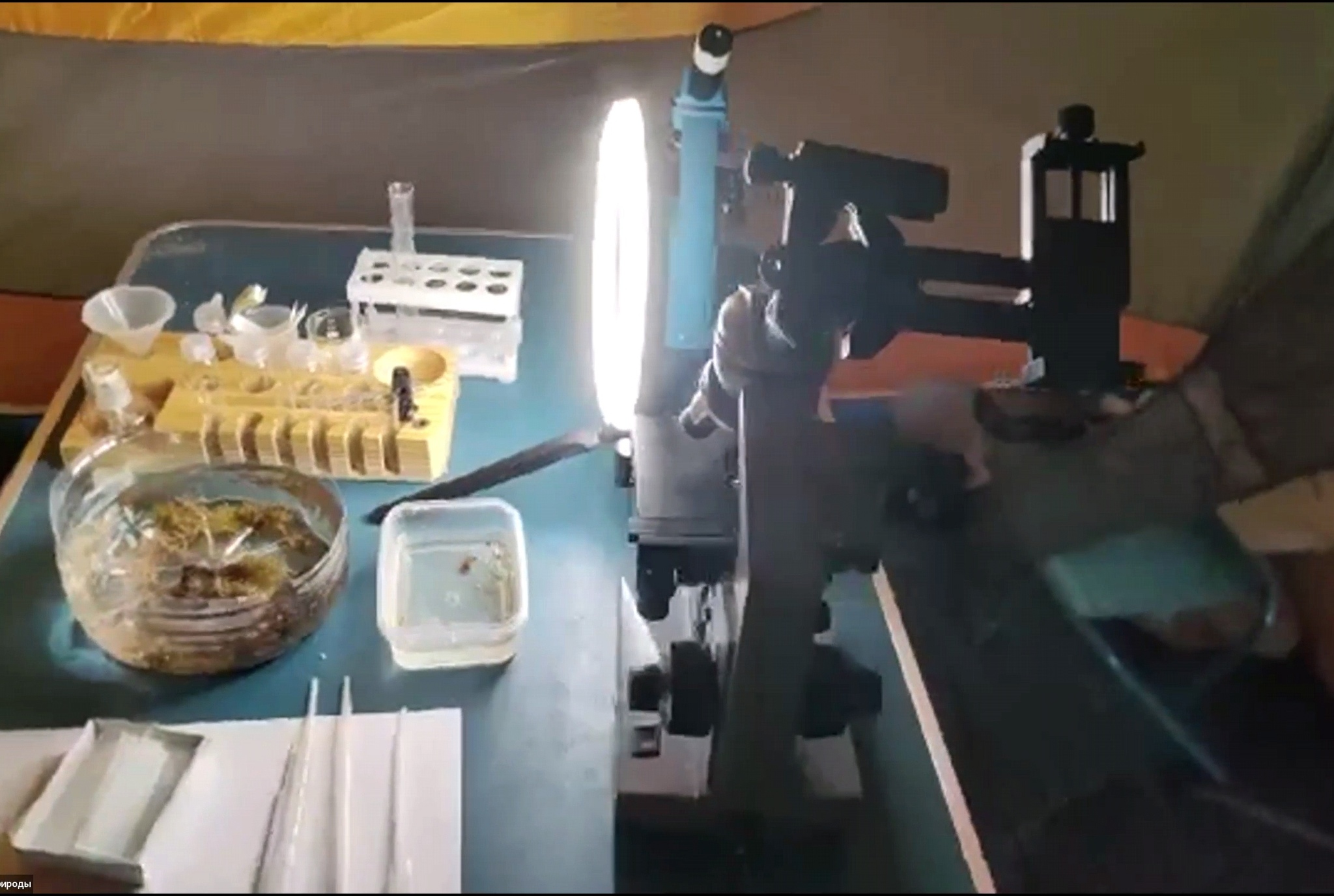 Да, чтобы такое рассмотреть - нужен был уже обычный микроскоп - в нашем случае это был Левенгук 320. Разместил его в палатке вместе с прочим полевым скарбом - пипетки/пробирки/пинцеты.